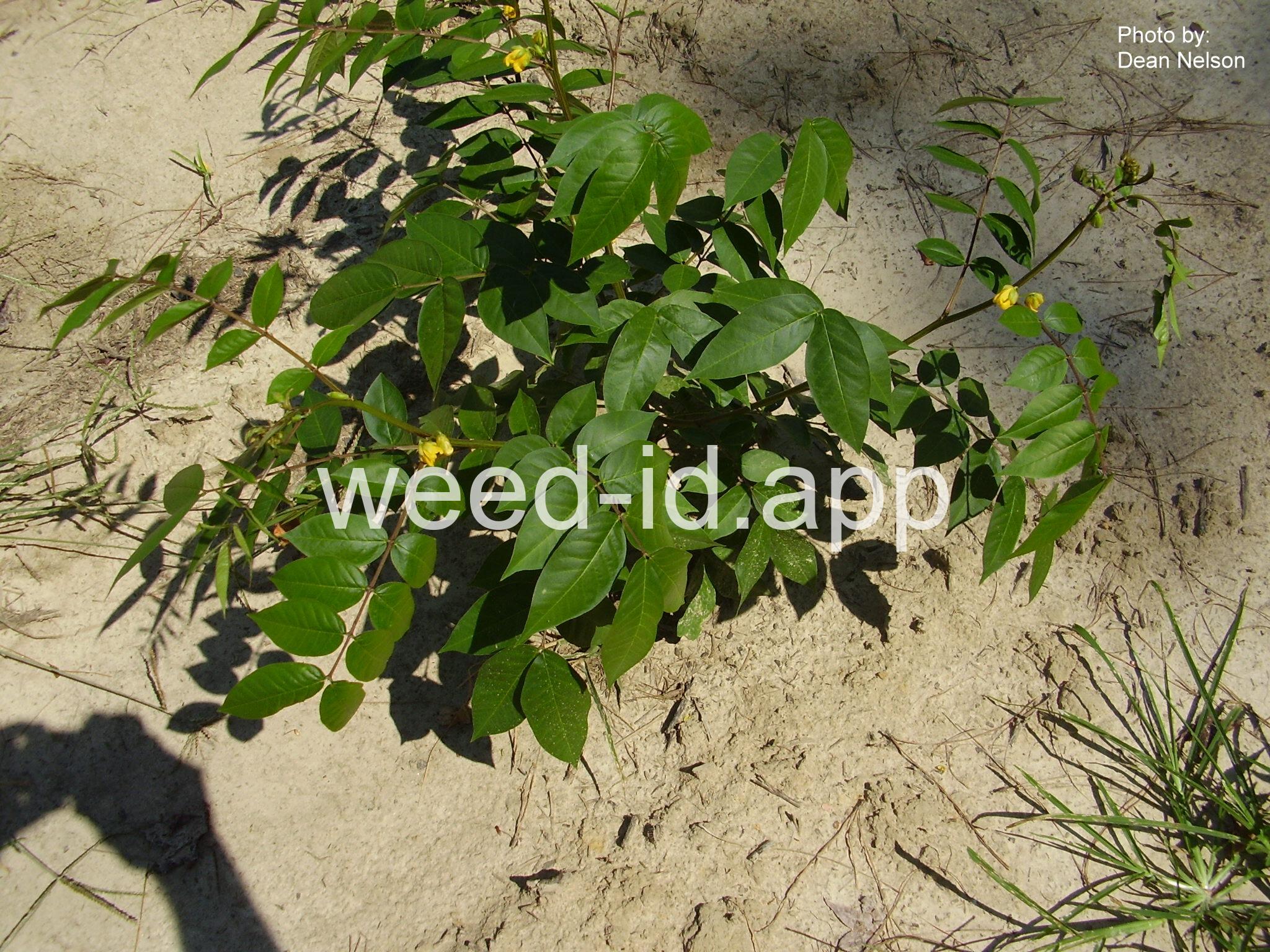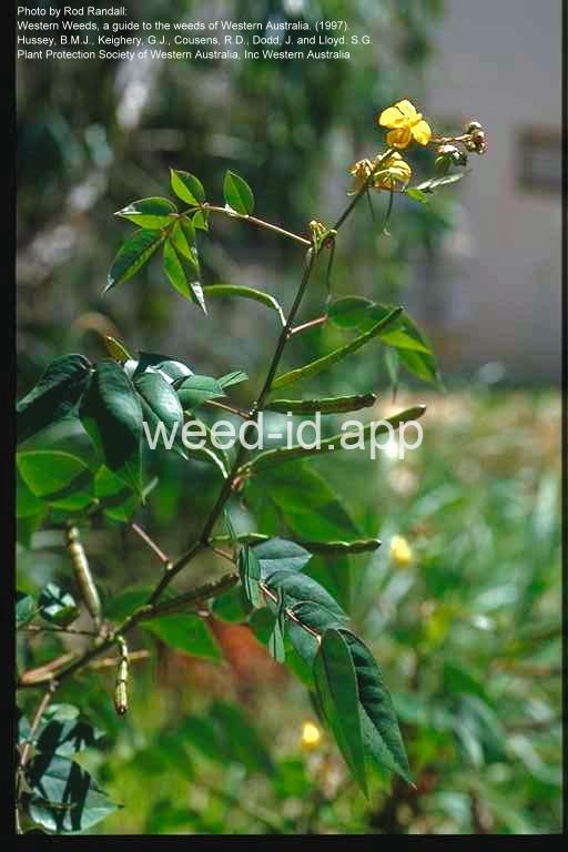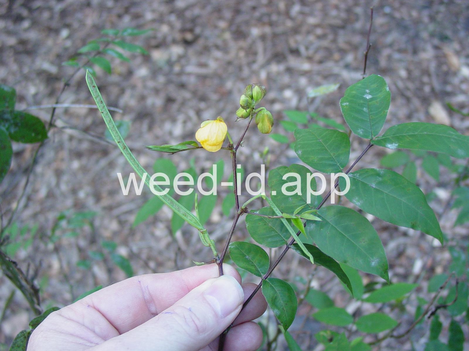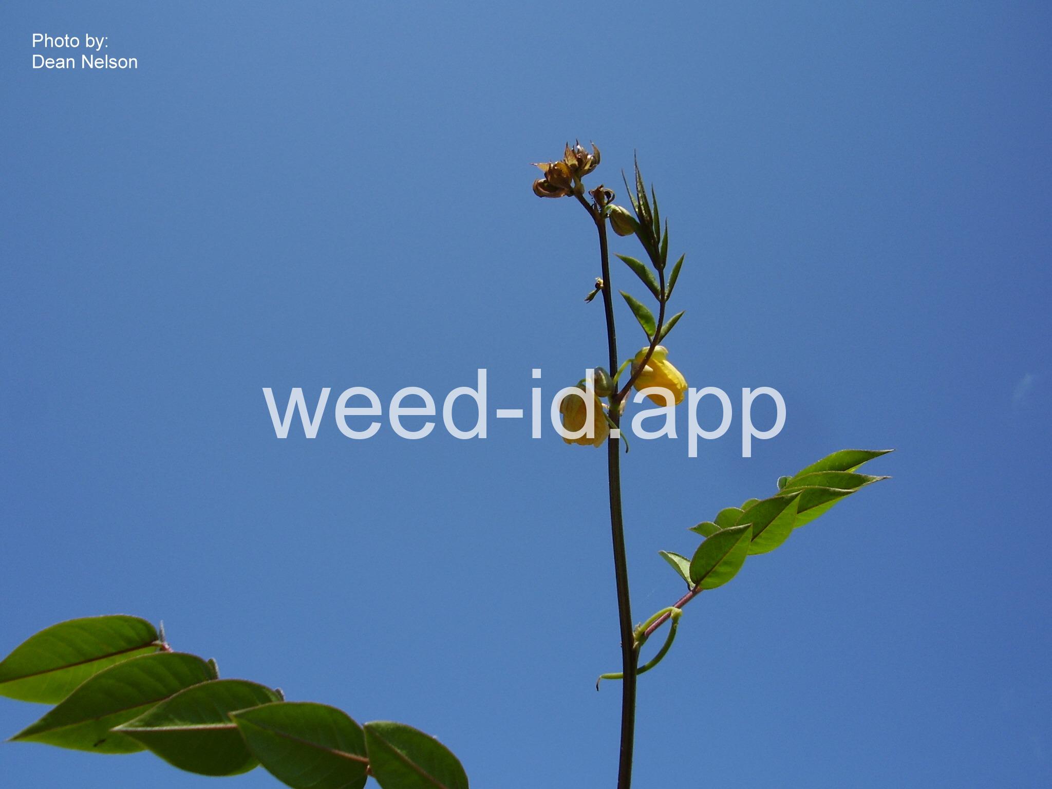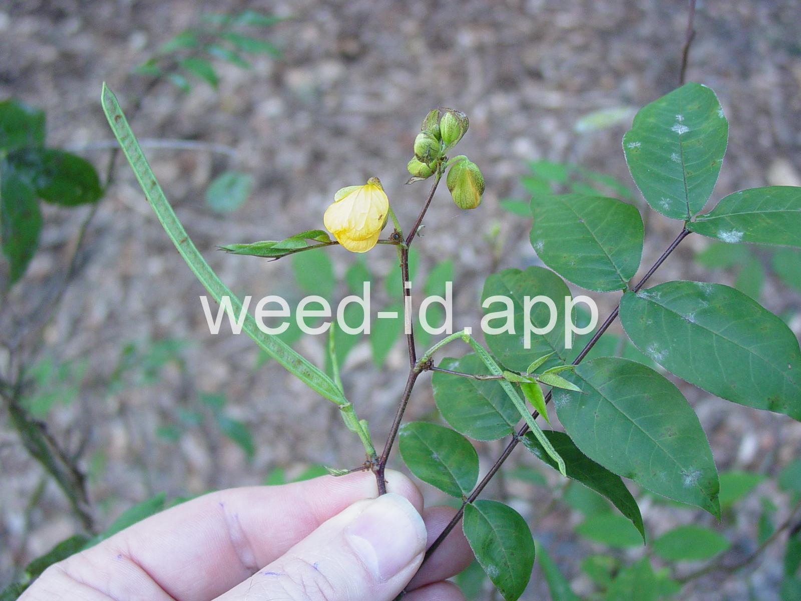 An erect annual with 8, 10, or 12 pointed leaflets per leaf. The fruit is a long, narrow legume. The flowers are yellow and one to several per leaf axil.