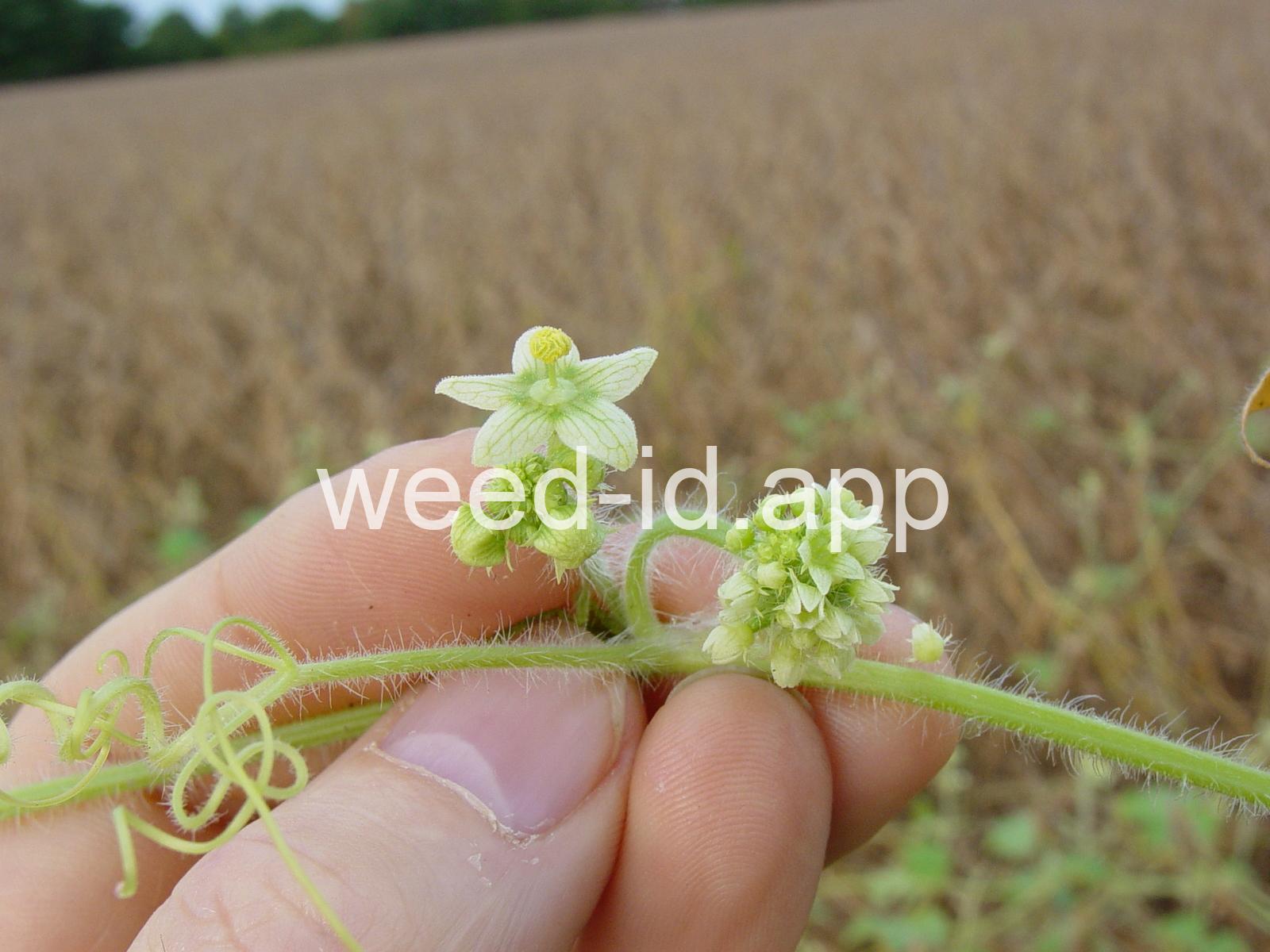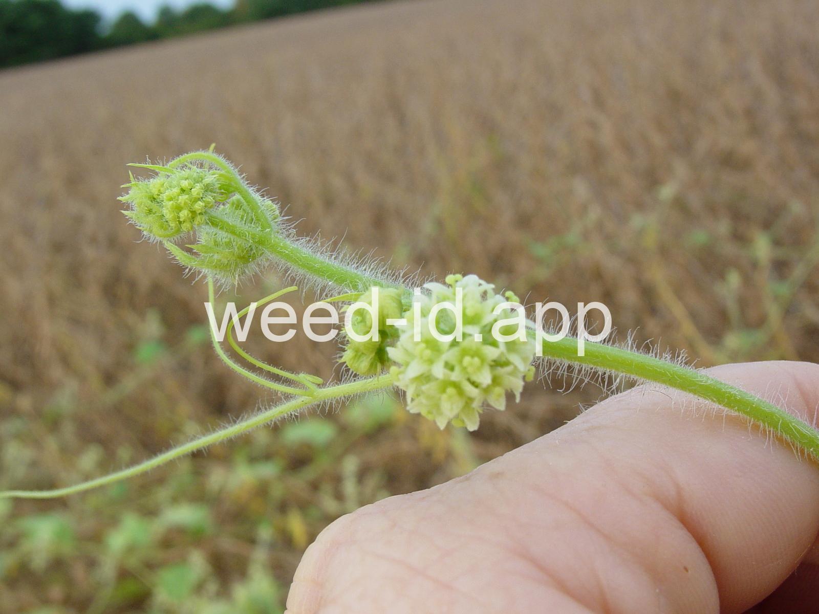 This annual vine has palmately veined, 5-lobed leaves. The fruit is a small cluster of 3 to 5 small burs. It is generally found climbing in trees or bushes along water courses.