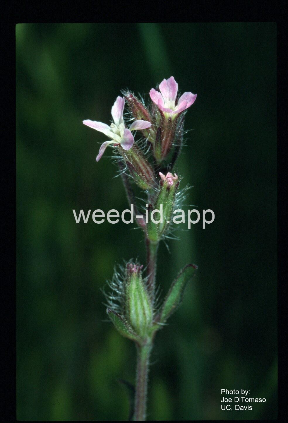 An annual with 5 pink-to-white petals and opposite leaves. The upper part of the plant is covered with sticky hairs. The sepals form a tube with 10 distinct ribs. The flowers are primarily on one side of the flowering stalk.