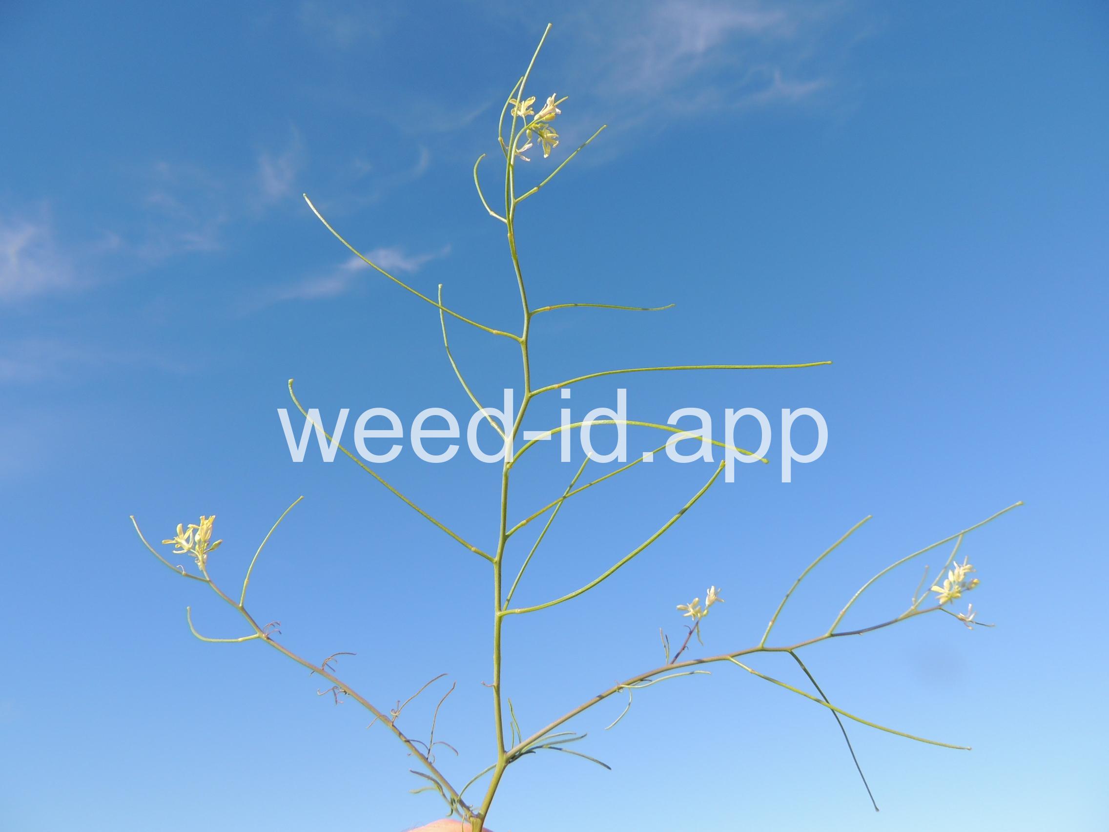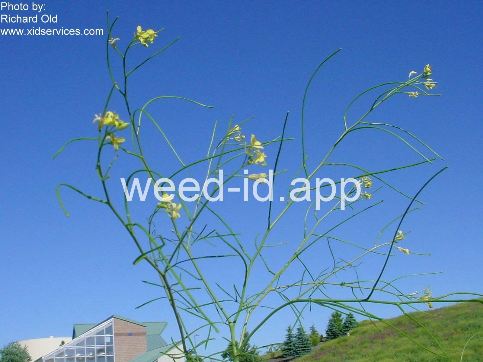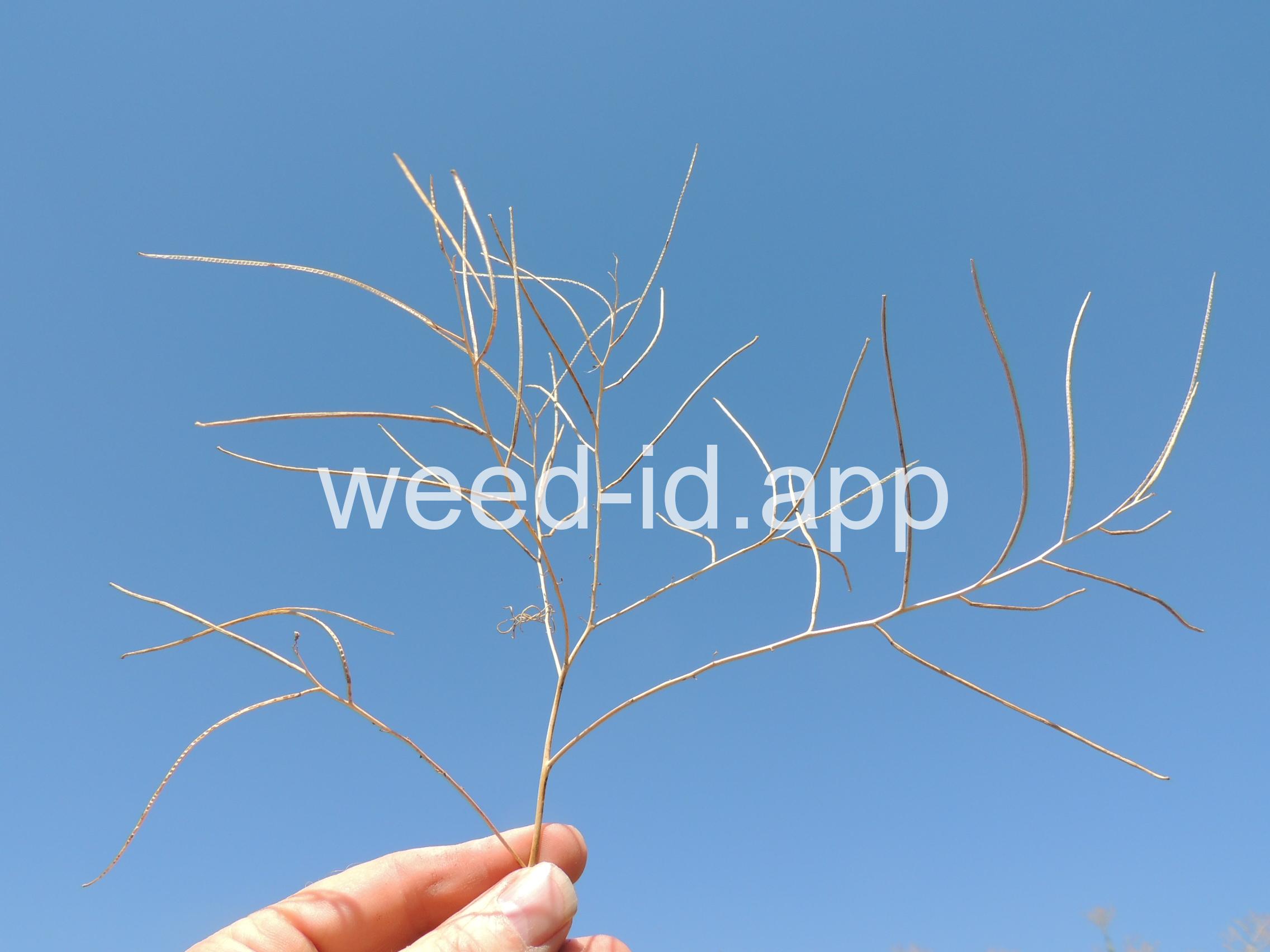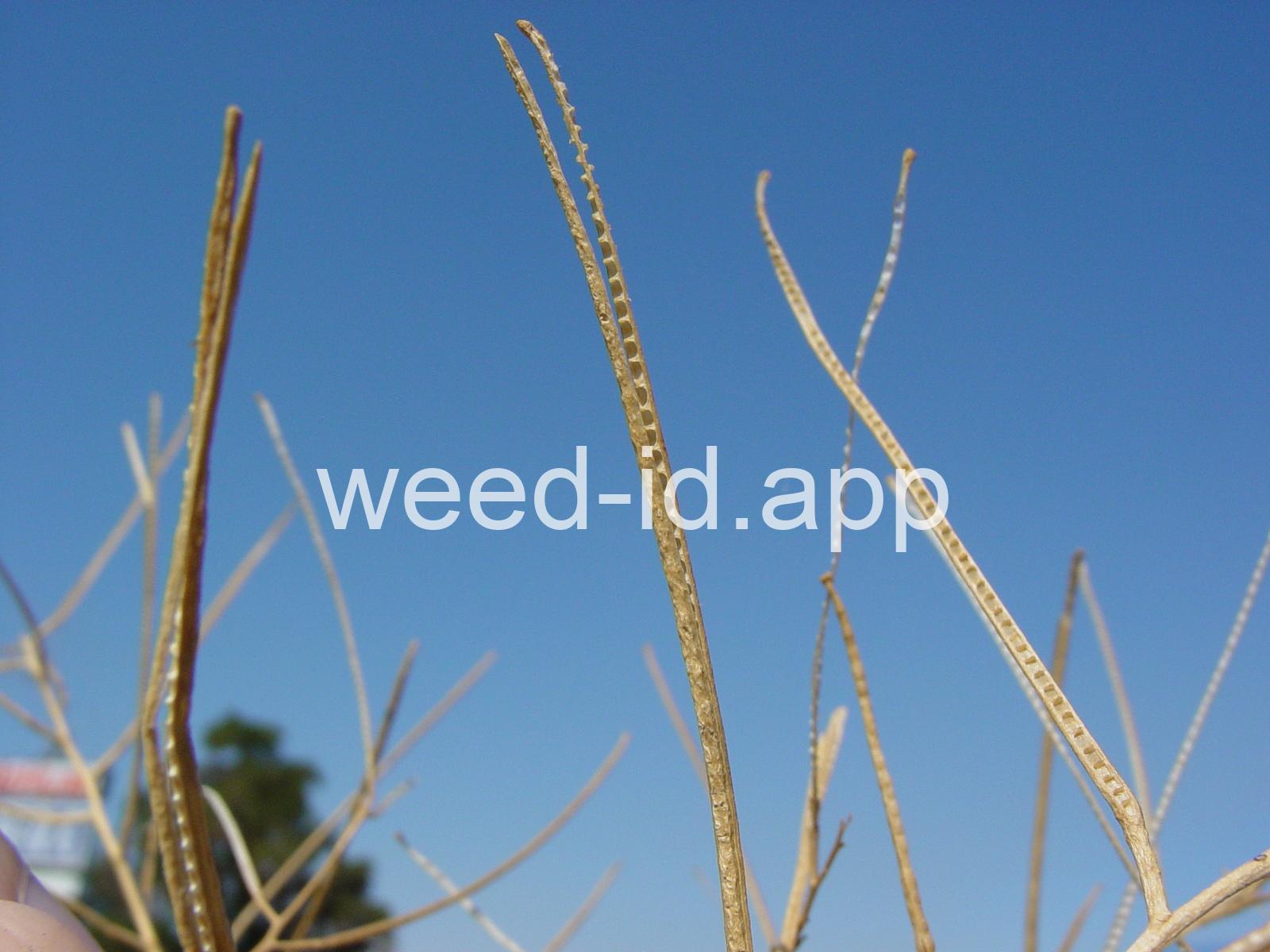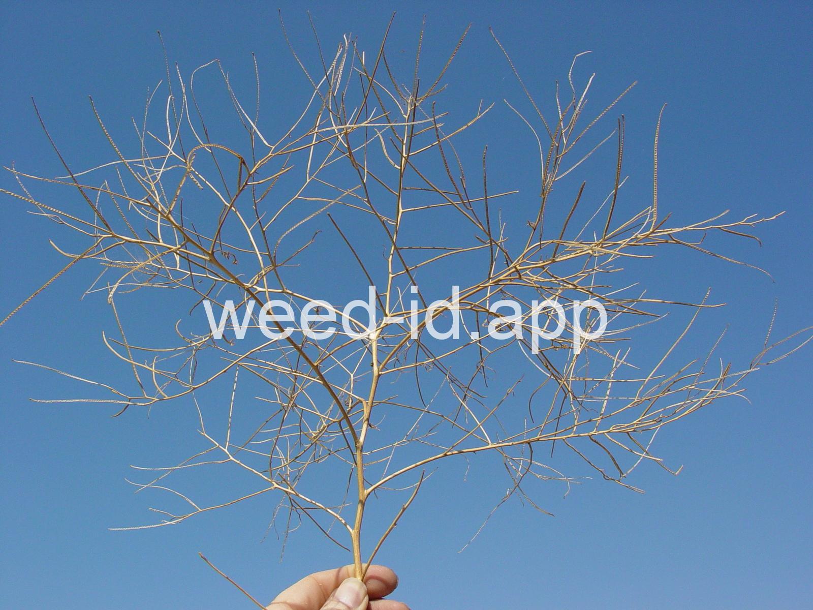 The seedling of this species is misidentified in the 1991edition of Weeds of the West (that`s yellow starthistle) but correct in the 1992 edition. Also known as `Jim Hill mustard` for the railroad man which it followed throughout the west. The seed pods, which are up to 4 inches long but only about 2 mm wide, are a distinctive feature of this species. Second only to Russian thistle in its prevalence as a tumbleweed in most areas. When the plants bolt in the spring, the flowering stalks of the larger plants can be peeled and eaten, raw or cooked.