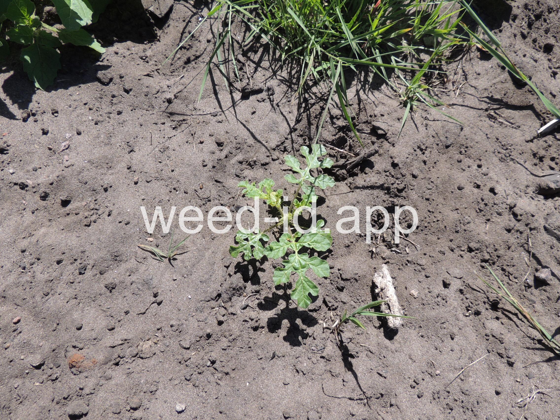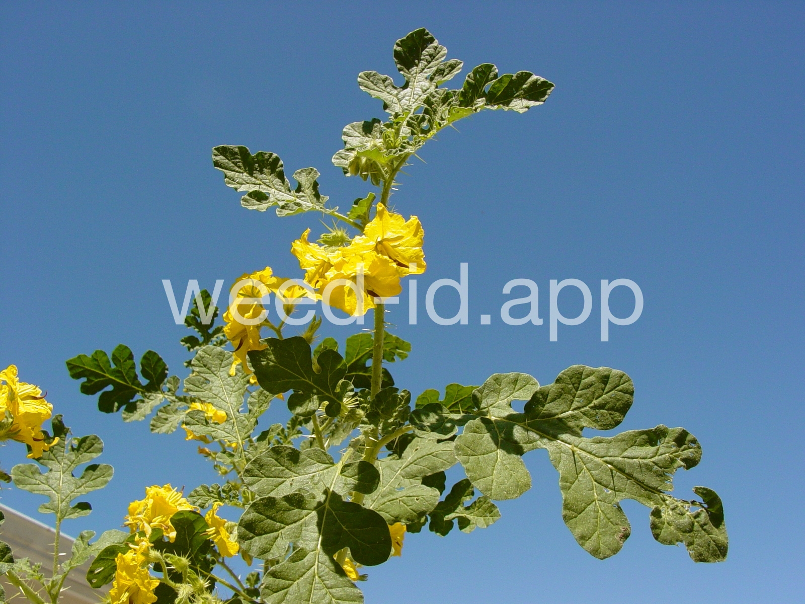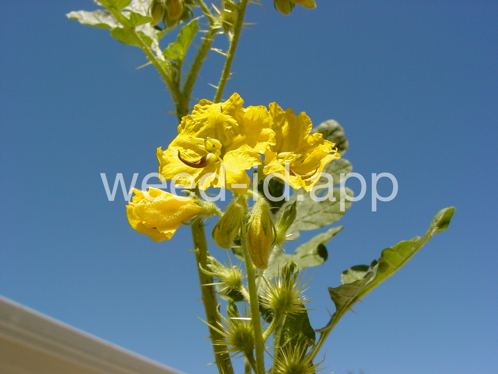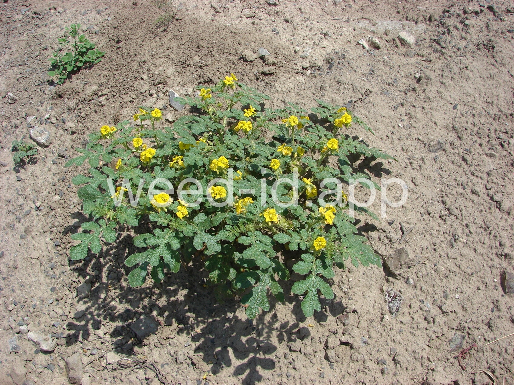 Buffalobur is native to the American southwest where it evolved to grow in the highly disturbed areas caused by the buffalo wallows. The leaves have large, rounded lobes and are spiny, particularly on the lower midrib. The flowers are yellow with 5 petals forming a tube about 1 inch broad. One of the anthers is much longer than the other four. The fruit is a somewhat spherical, spiny capsule. Buffalobur has spread to virtually every state in the U.S. as a contaminant in seed.