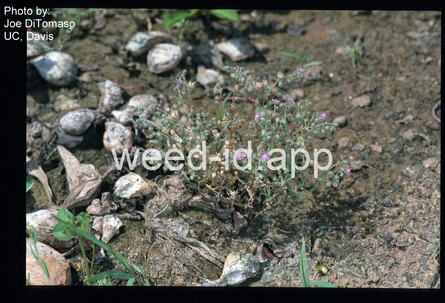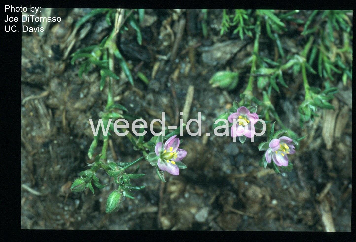 An annual with very narrow, opposite leaves and prominent triangular stipules. The flowers are pink to white with three styles.
