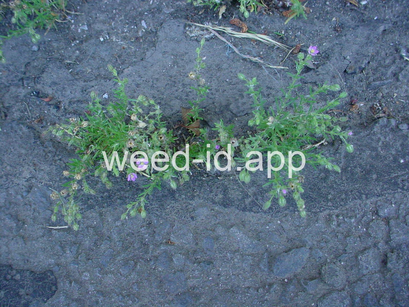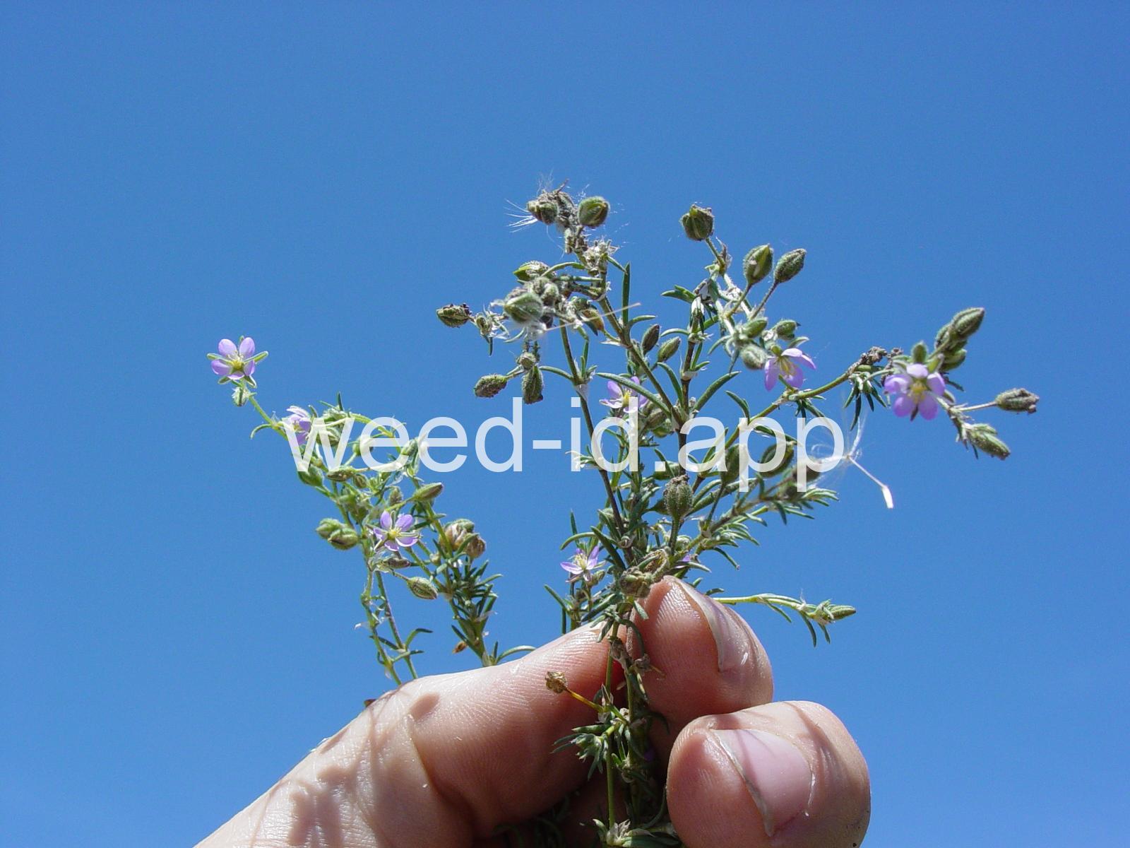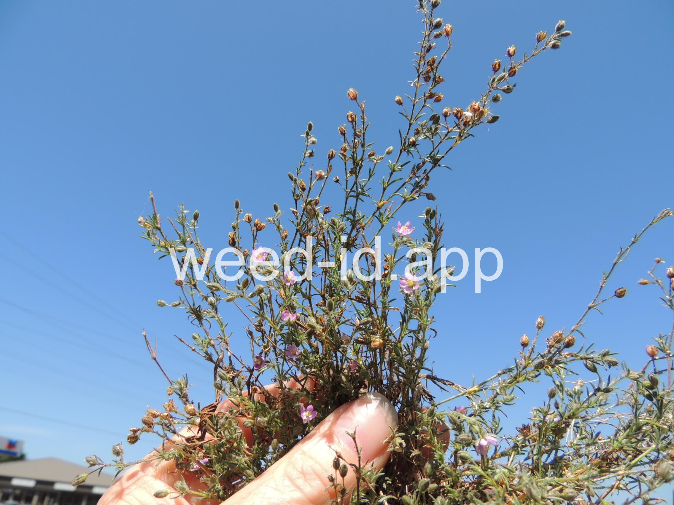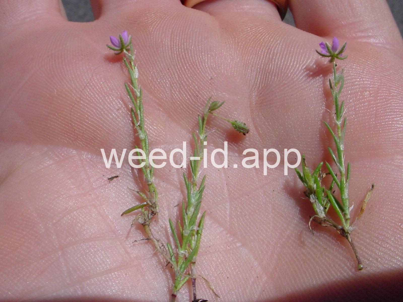 A prostrate to ascending annual with narrowly linear leaves and small, pink flowers. The leaves clustered (fascicled) and each leaf subtended by a dry membranous triangular stipule.