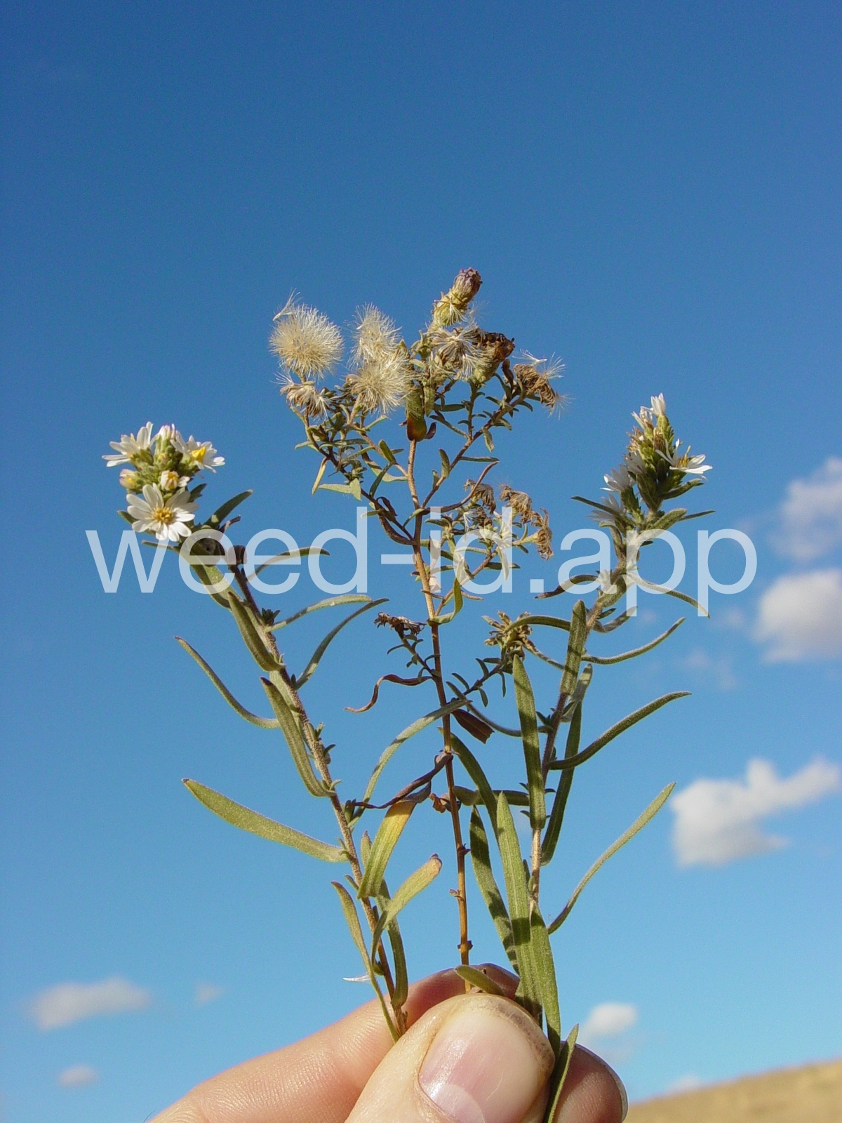 There are many very similar species. The crucial characters here being small flower heads and the plants arising from creeping rhizomes. The ray flowers are usually white (rarely pink), and the stem leaves are very small and linear. Also = Aster multiflorus per South Dakota Weeds