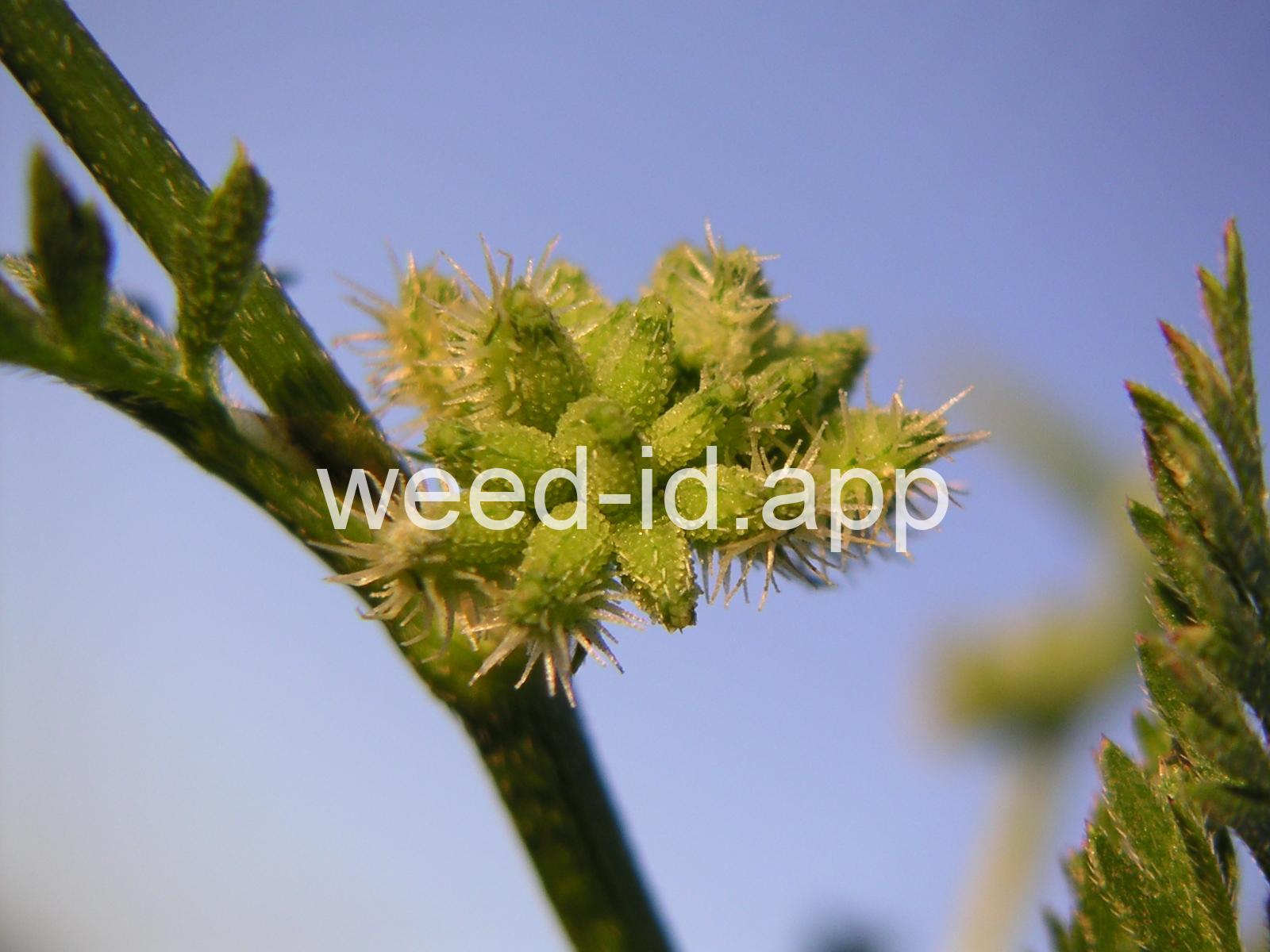 Differing from other members of the genus by its low spreading stature and extremely short flowering stems (peduncles), causing the flowers and fruits (burs) to appear in dense clusters hidden among the leaves.