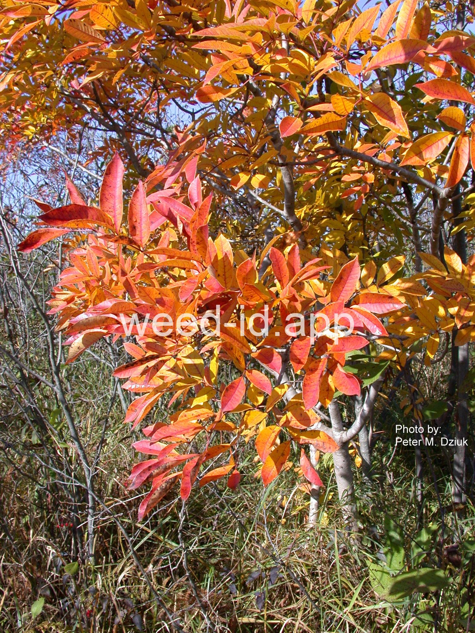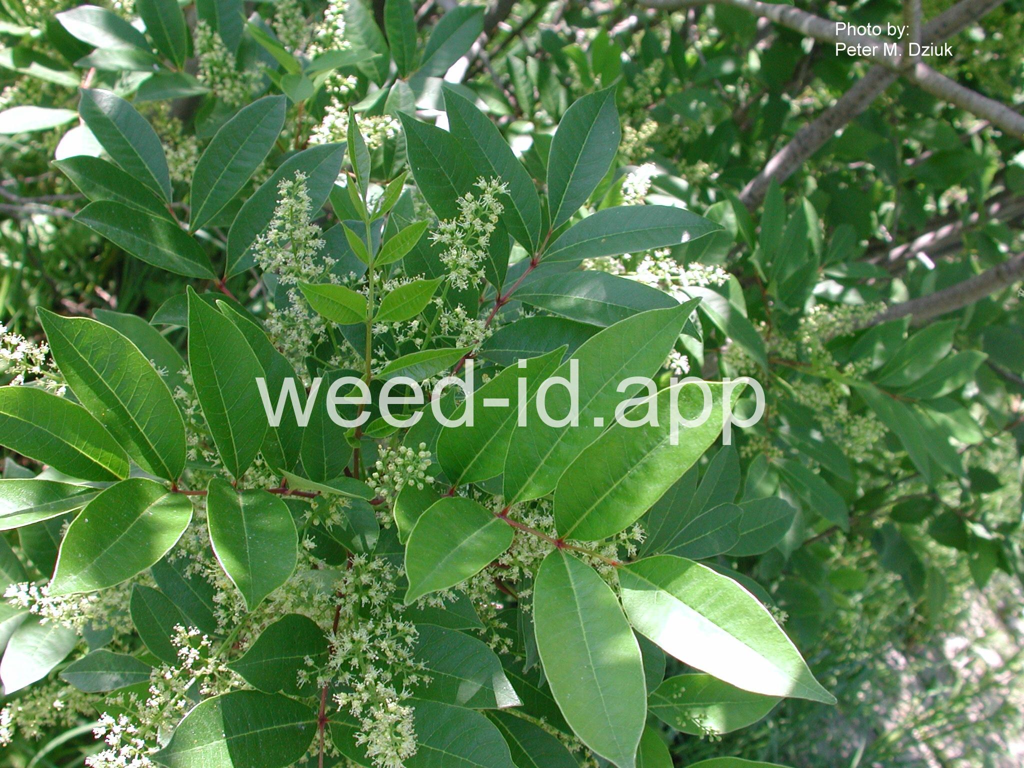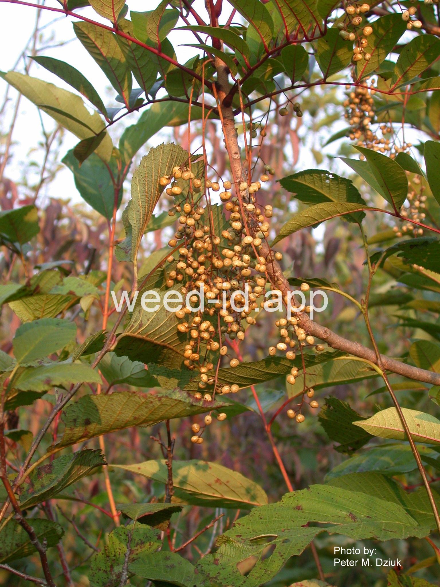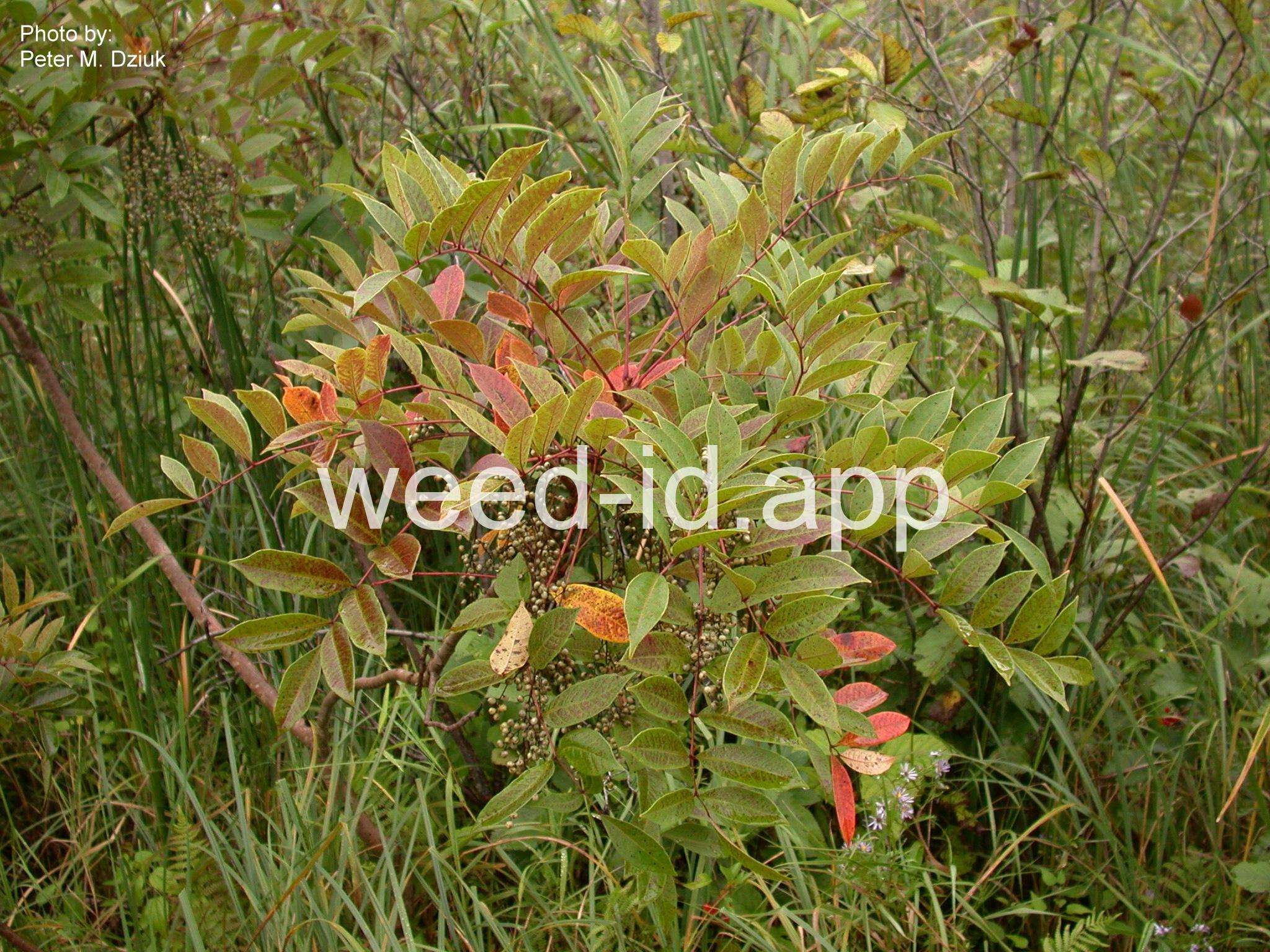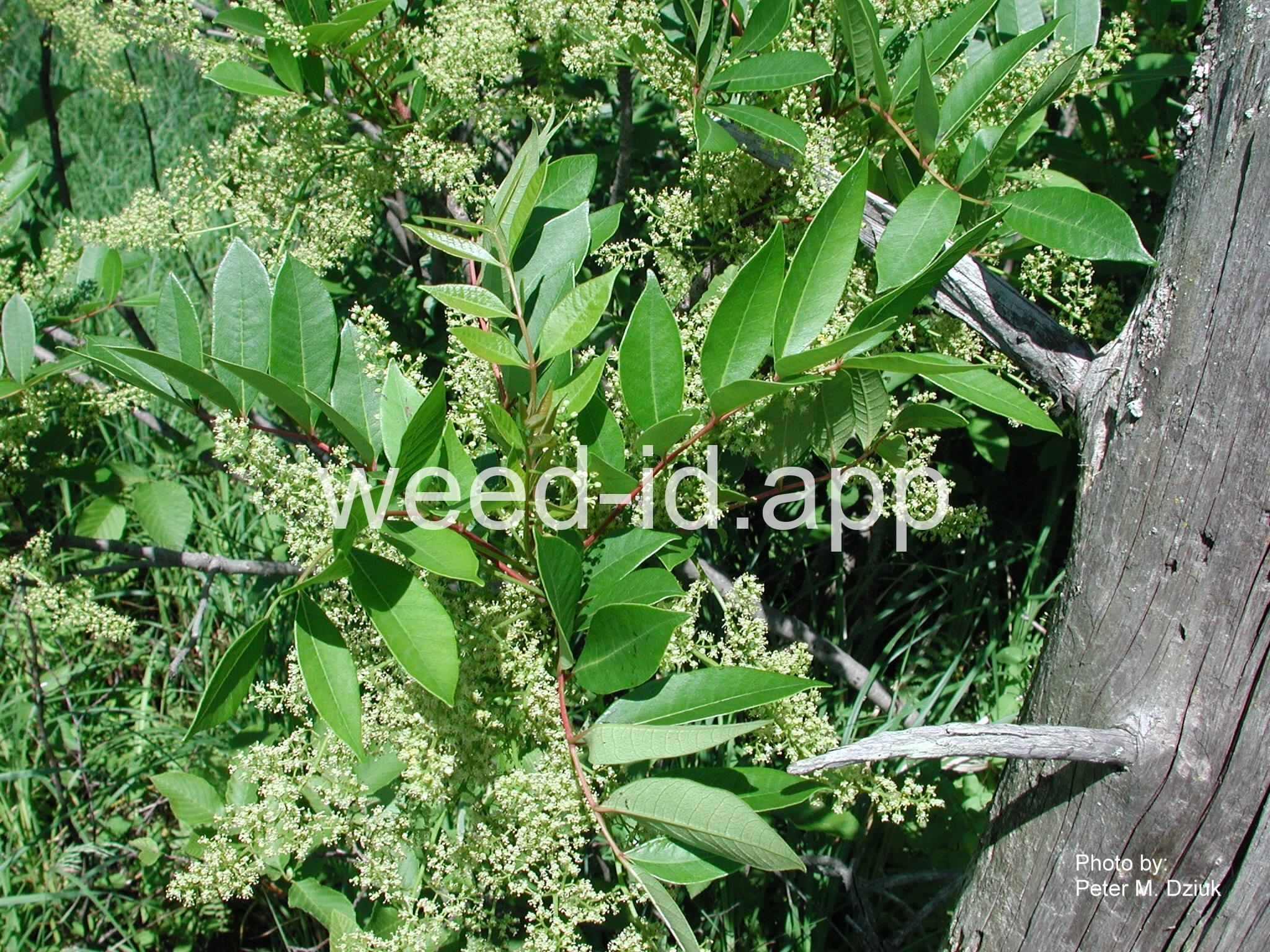 Shrubs or small trees, leaves odd pinnately compound with 7 - 13 leaflets. Fruit a cluster of whitish berries. Extremely dermal toxic!!!