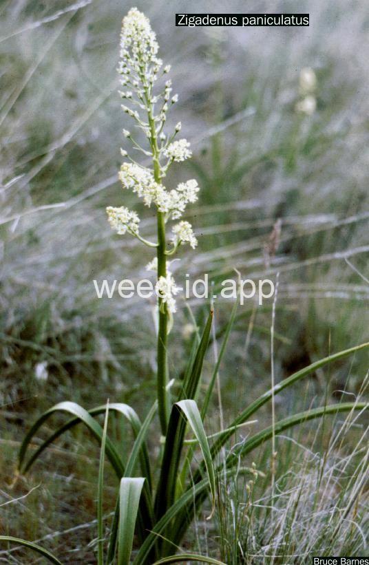 A native perennial wildflower. Inflorescence an elongate panicle of small yellowish-white flowers, apparently with 6 petals. The leaves long and narrow with parallel veins. The plants arise from a bulb which looks like an onion but has no onion-like aroma. As the common name suggests, this genus is quite toxic.