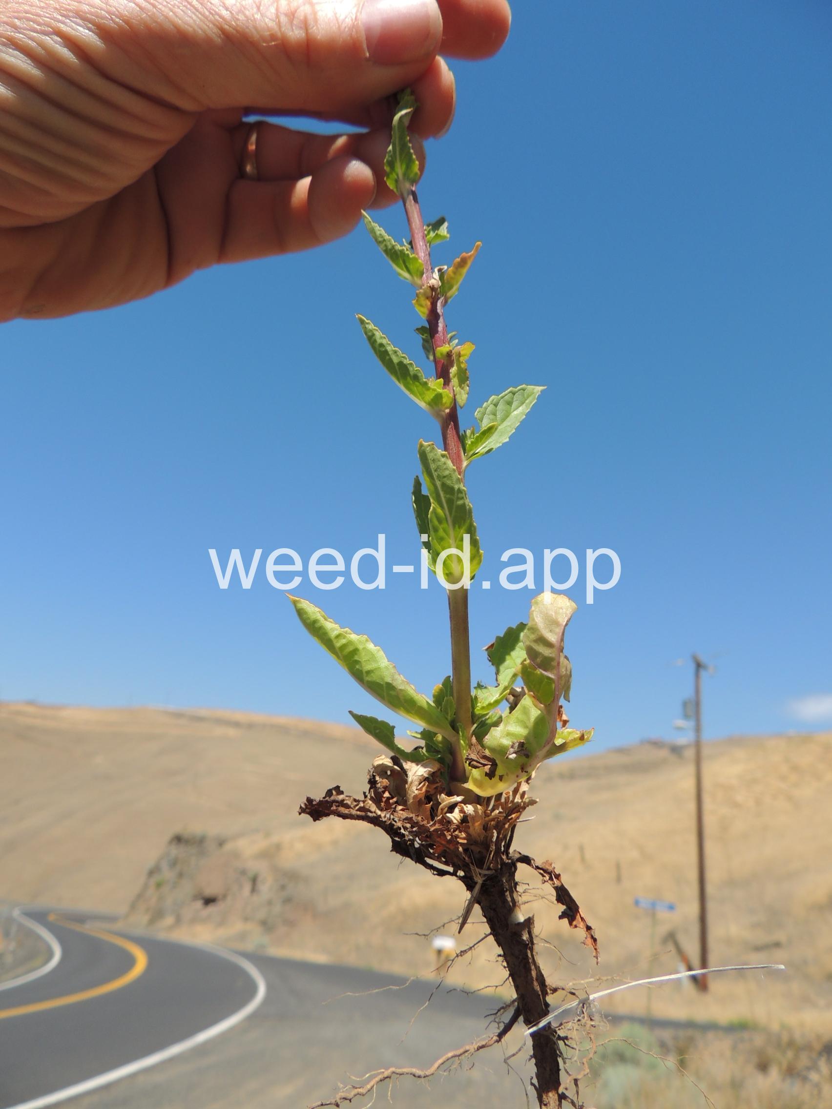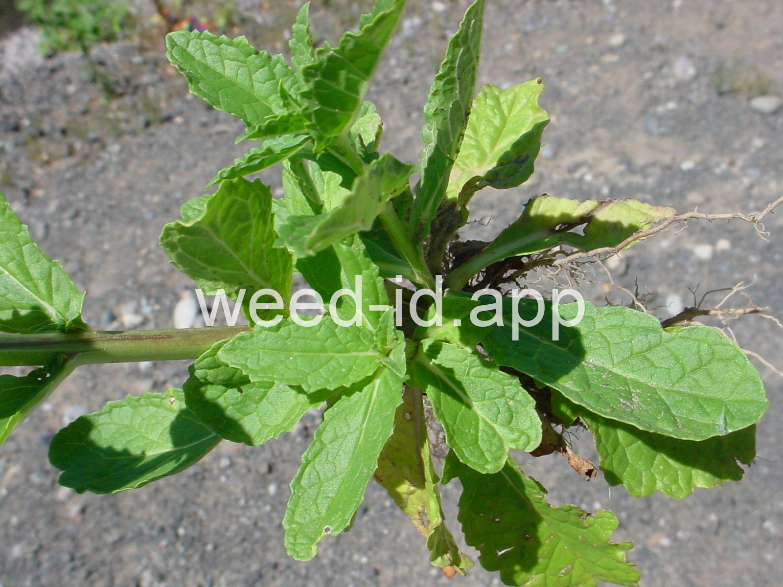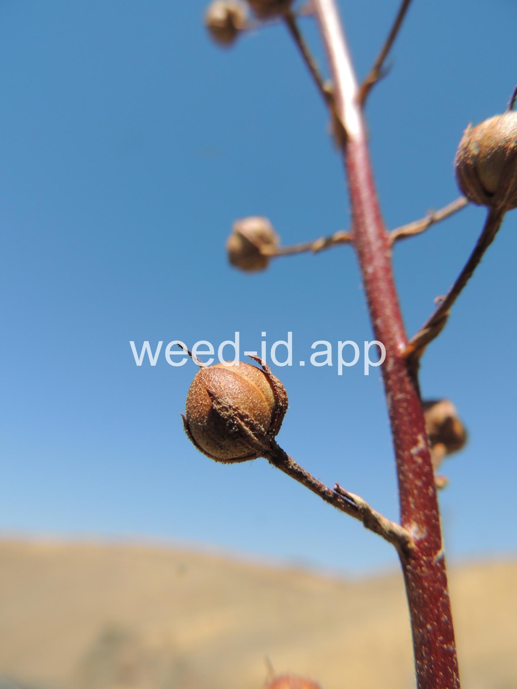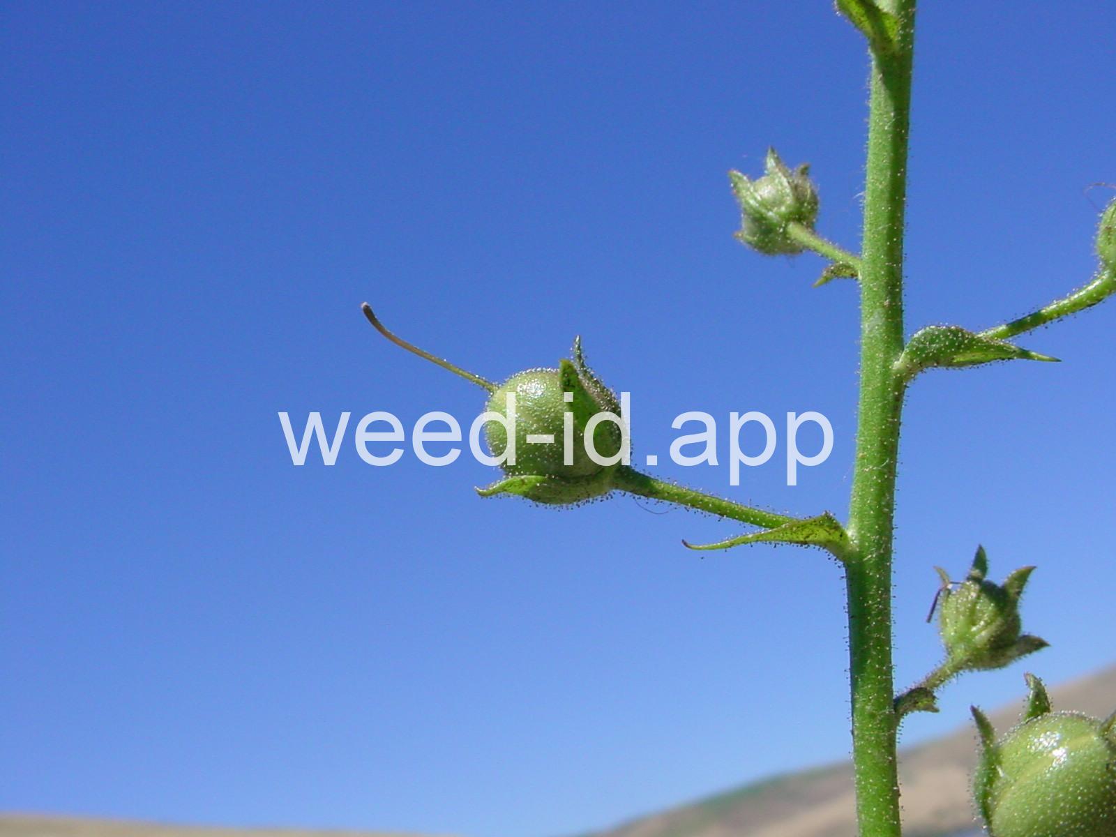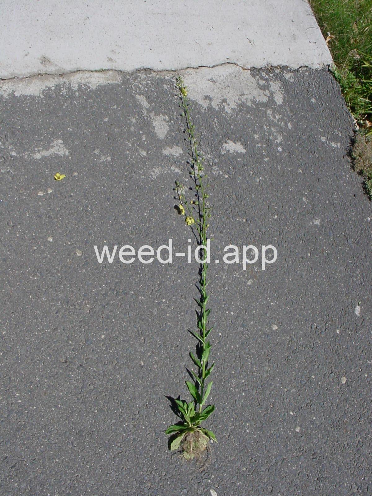 Moth mullein is a biennial weed of dry sites. The rosette leaves are dark green and hairless with a prominent white mid-vein and a strong peculiar odor. It is very similar in appearance to Verbascum virgatum (purplestamen mullein), but that species has stalkless (sessile) flowers.