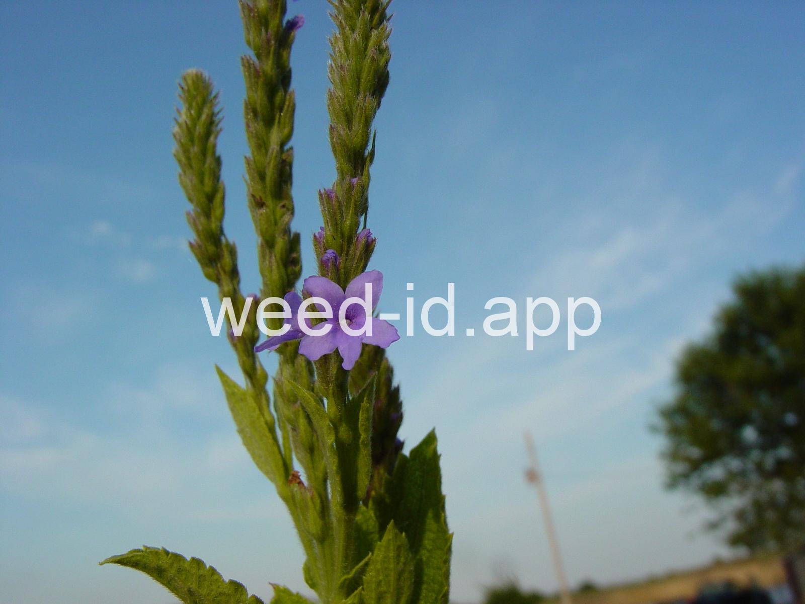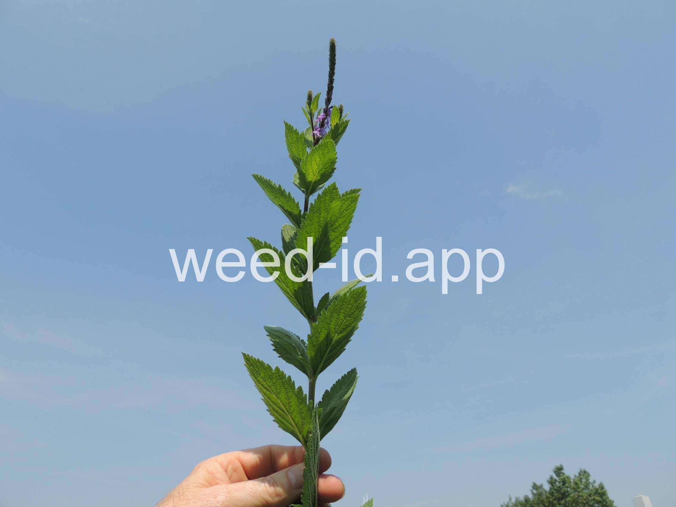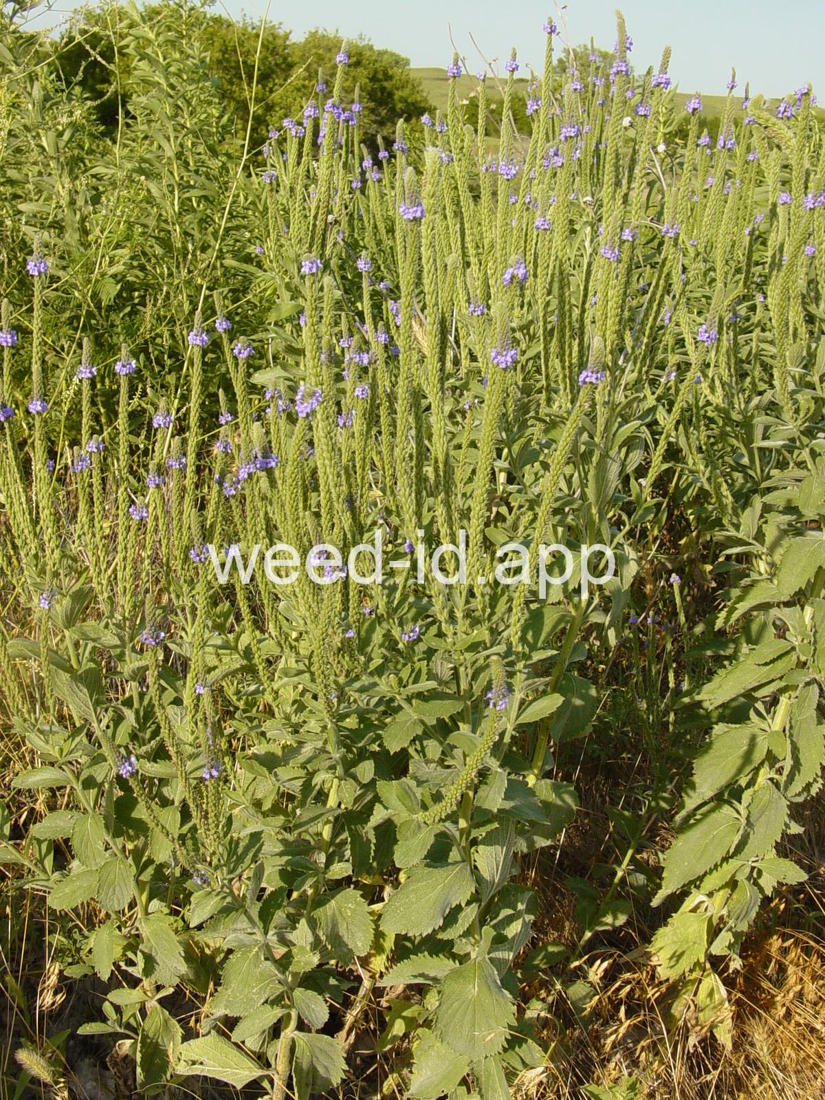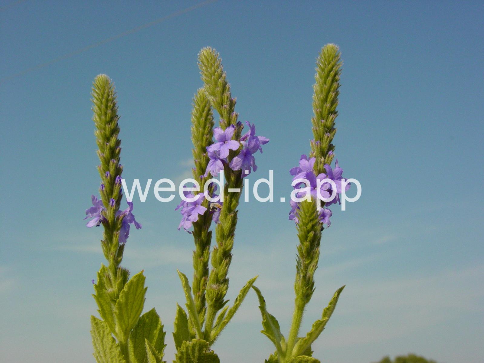 Similar to Verbena hastata but with the stem leaves sessile and very hairy. Also known as `wooly verbena.` One of the most common weeds of over-grazed pastures in the Midwest. This stiff erect perennial has opposite toothed leaves and is commonly quite hairy. The tiny, blue tubular flowers grow in narrow spikes at the top of the plant. These spikes flower from the bottom up, forming a circle of flowers.