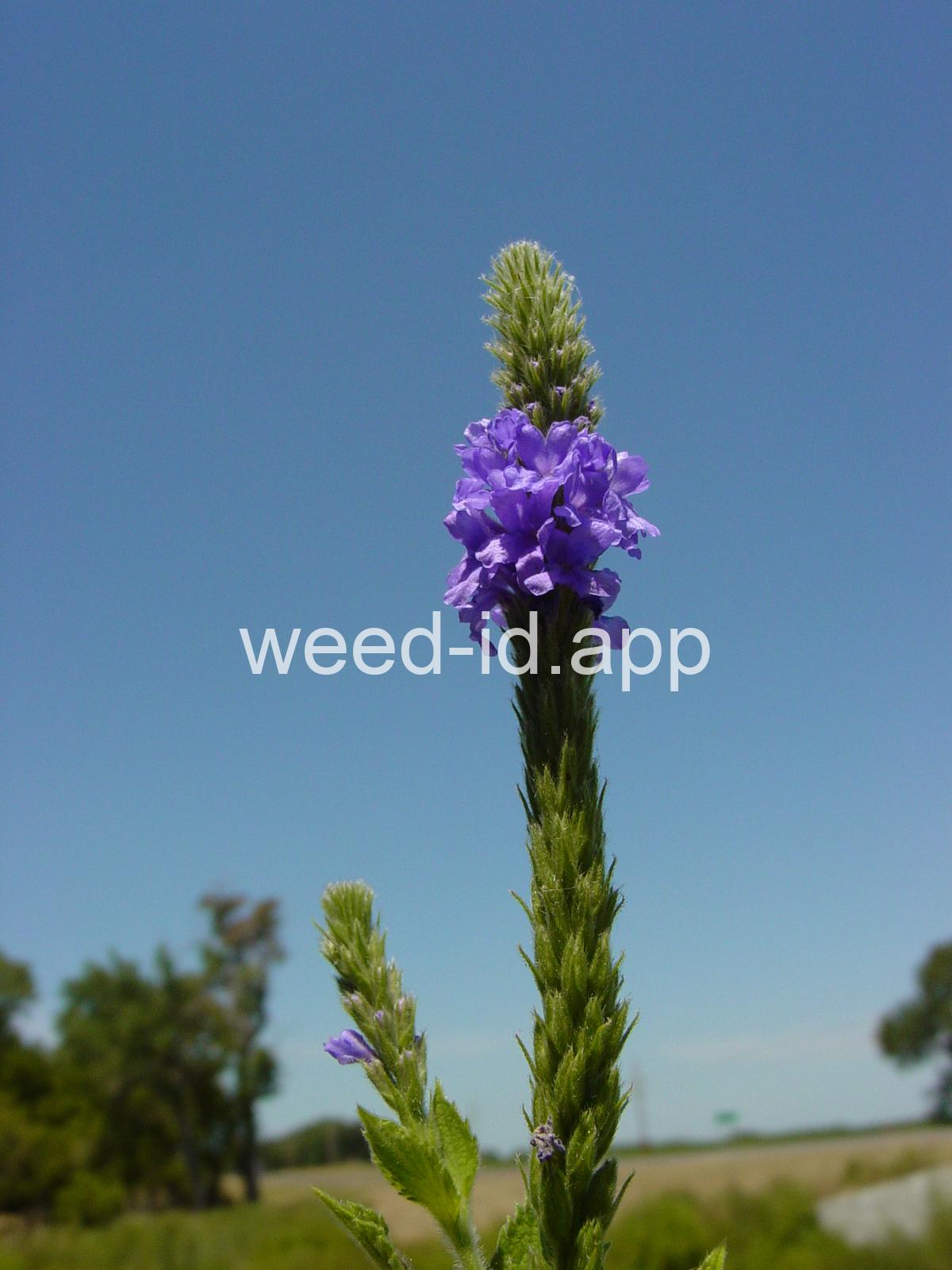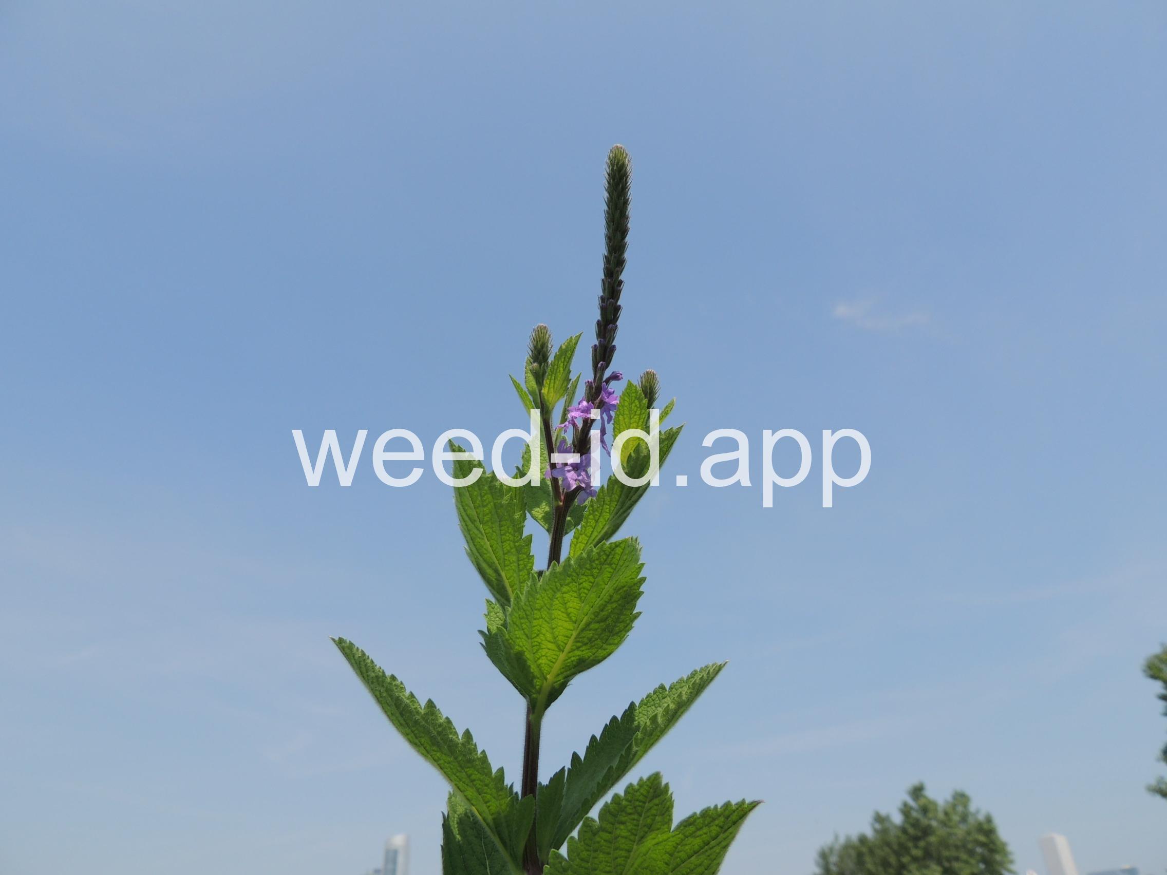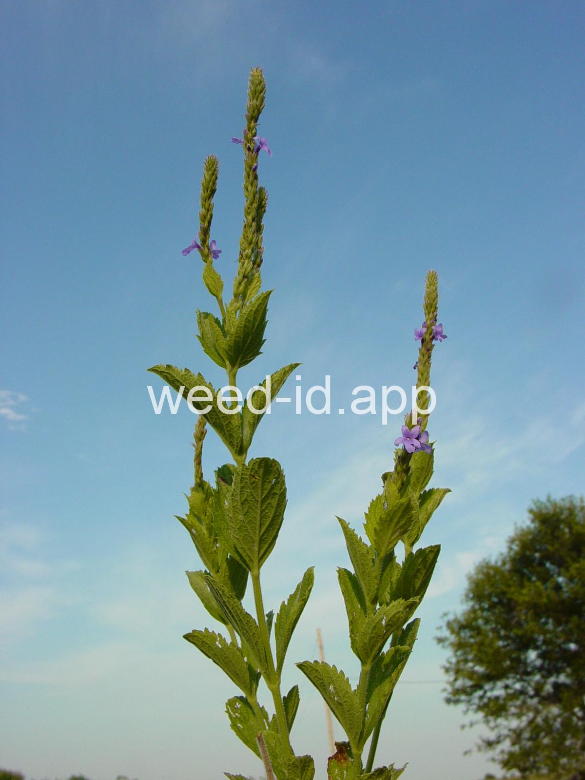 Similar to Verbena hastata but with the stem leaves sessile and very hairy. Also known as `wooly verbena.` One of the most common weeds of over-grazed pastures in the Midwest. This stiff erect perennial has opposite toothed leaves and is commonly quite hairy. The tiny, blue tubular flowers grow in narrow spikes at the top of the plant. These spikes flower from the bottom up, forming a circle of flowers.