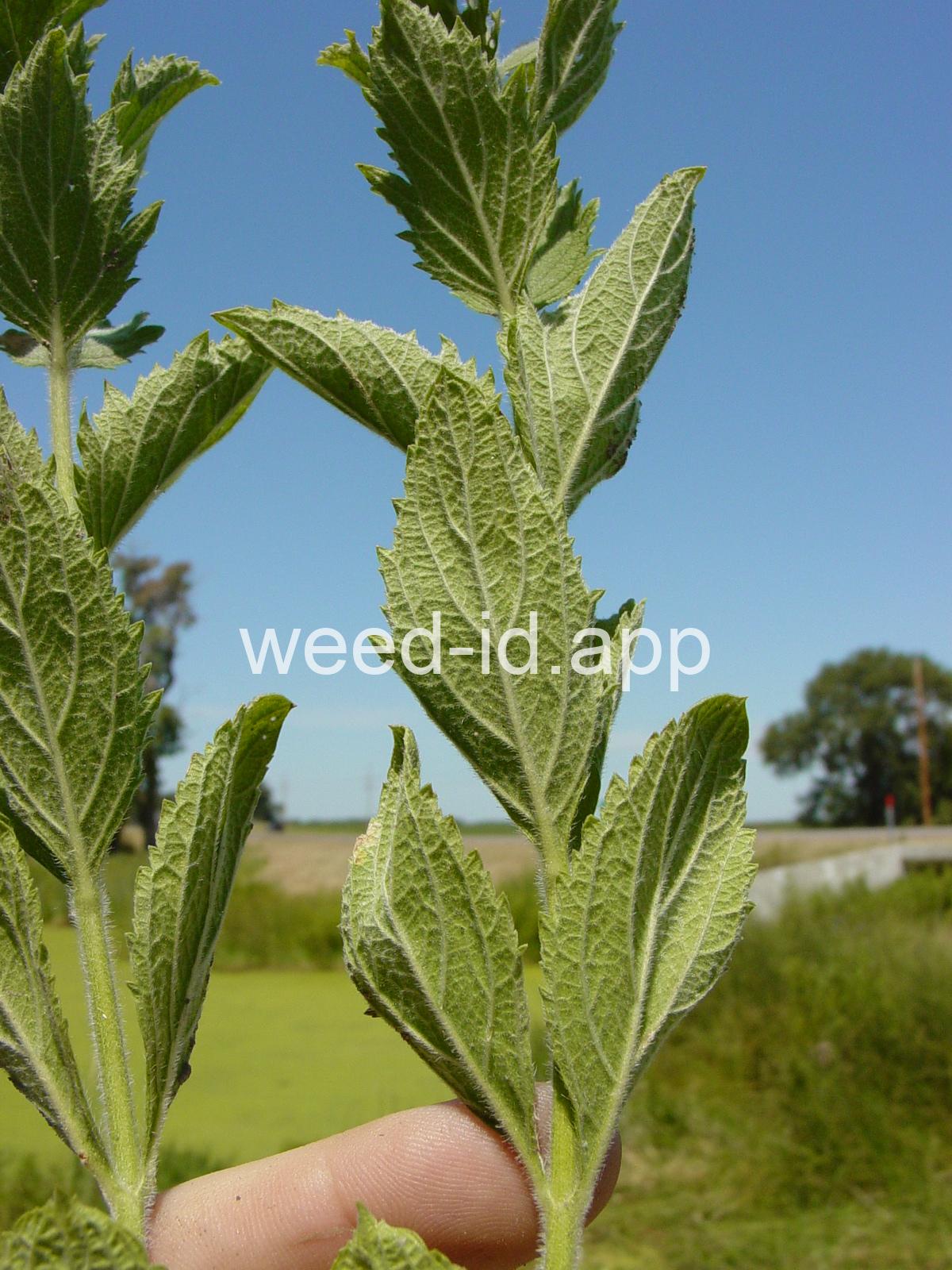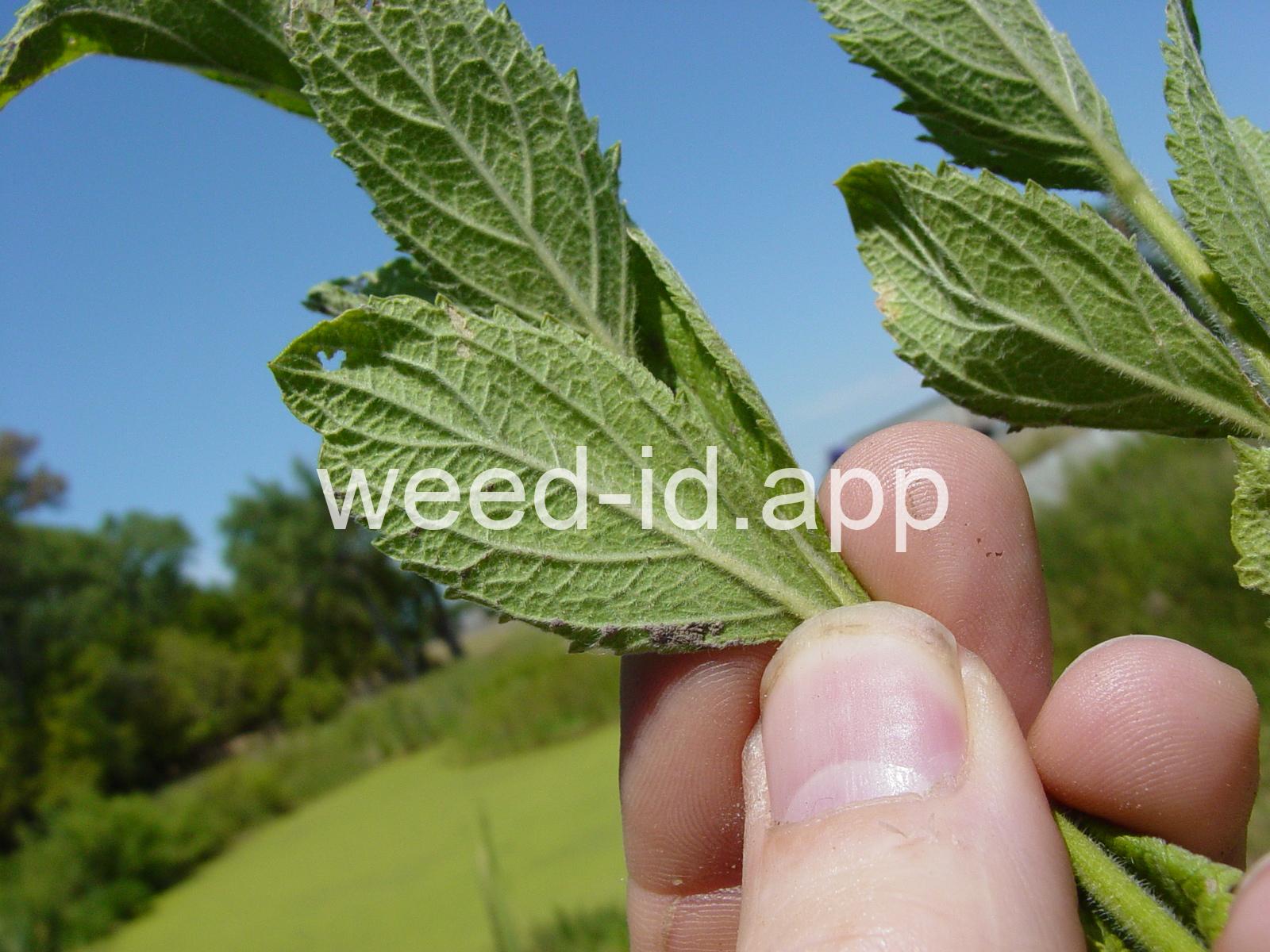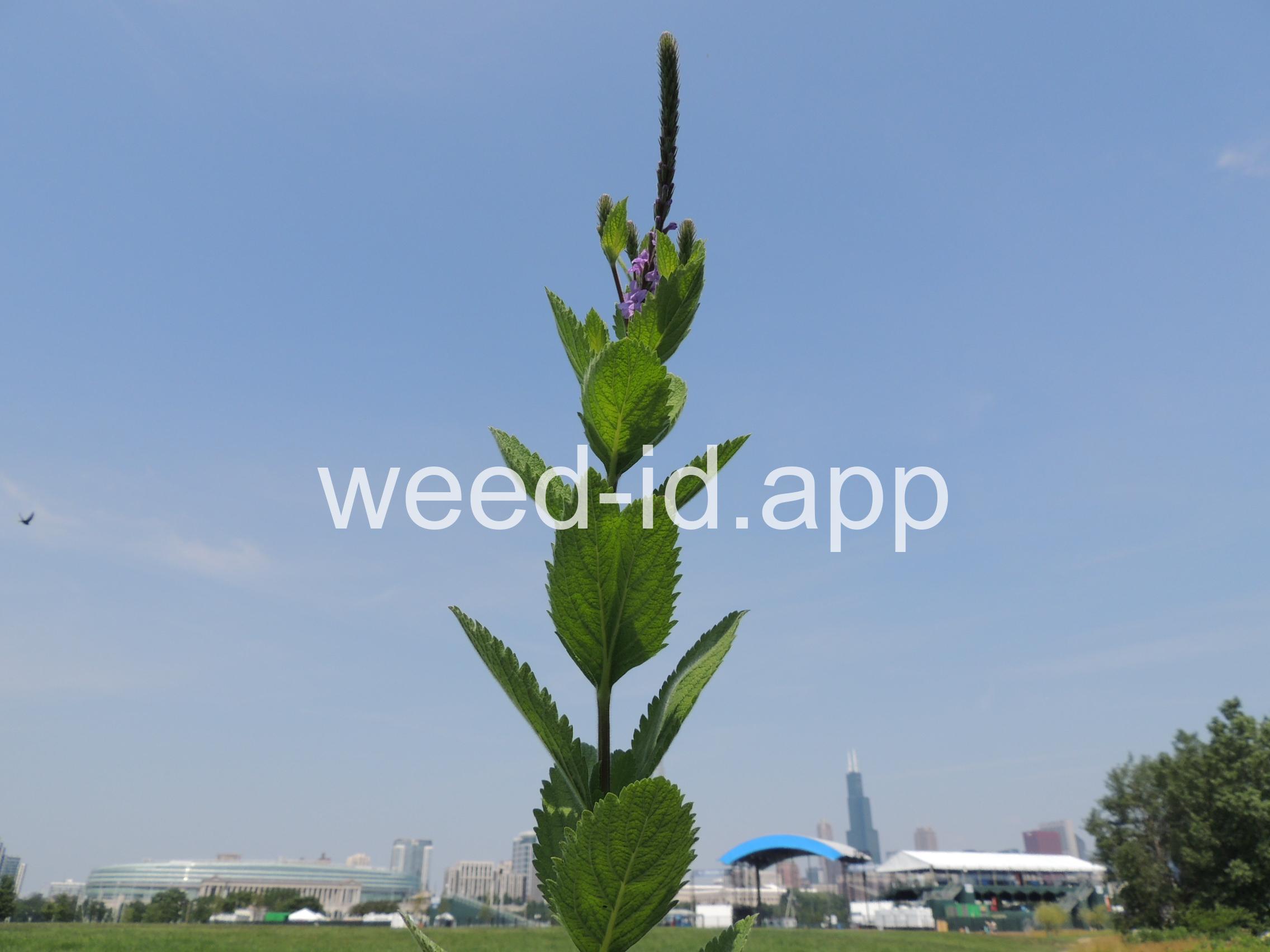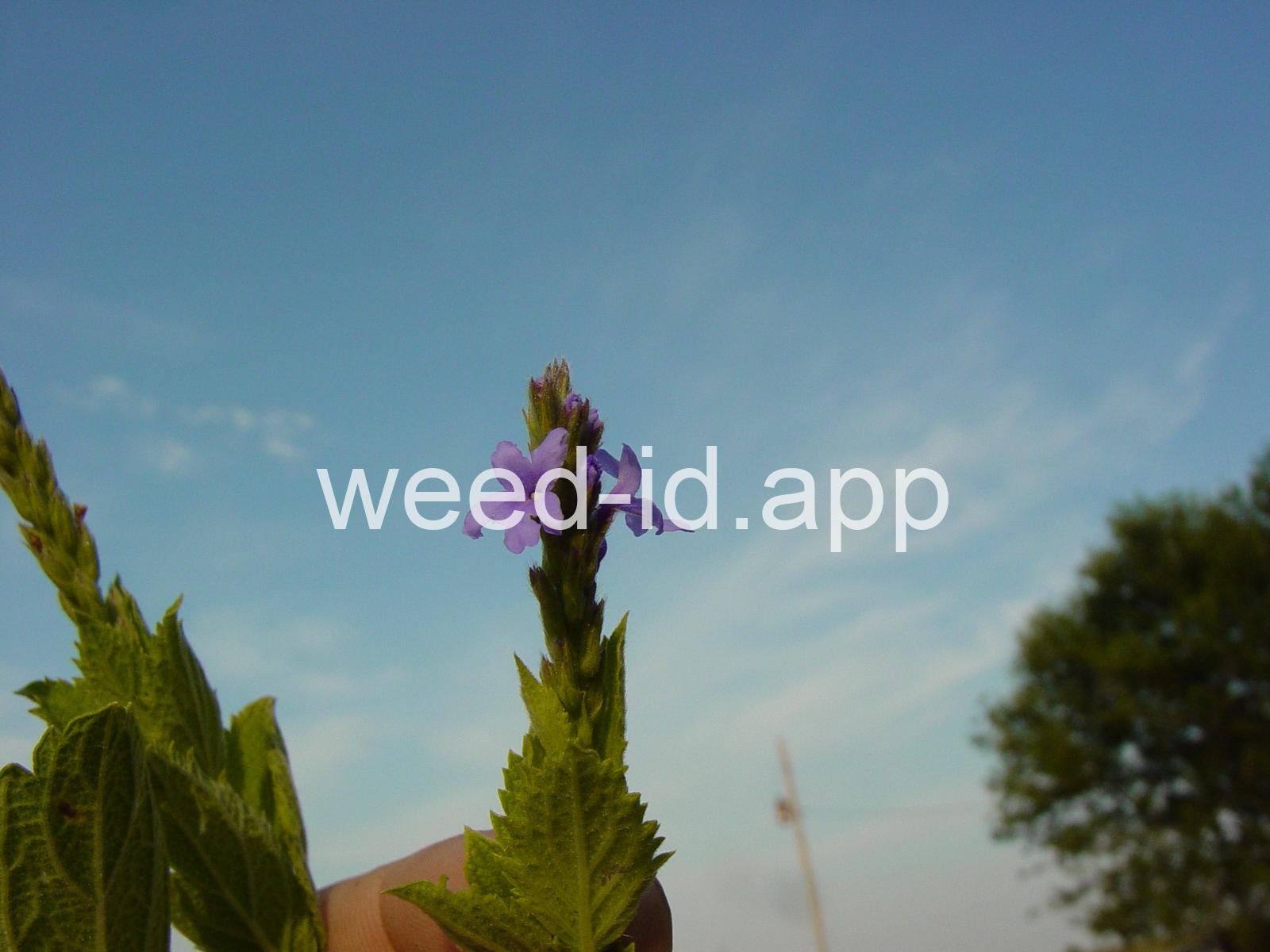 Similar to Verbena hastata but with the stem leaves sessile and very hairy. Also known as `wooly verbena.` One of the most common weeds of over-grazed pastures in the Midwest. This stiff erect perennial has opposite toothed leaves and is commonly quite hairy. The tiny, blue tubular flowers grow in narrow spikes at the top of the plant. These spikes flower from the bottom up, forming a circle of flowers.