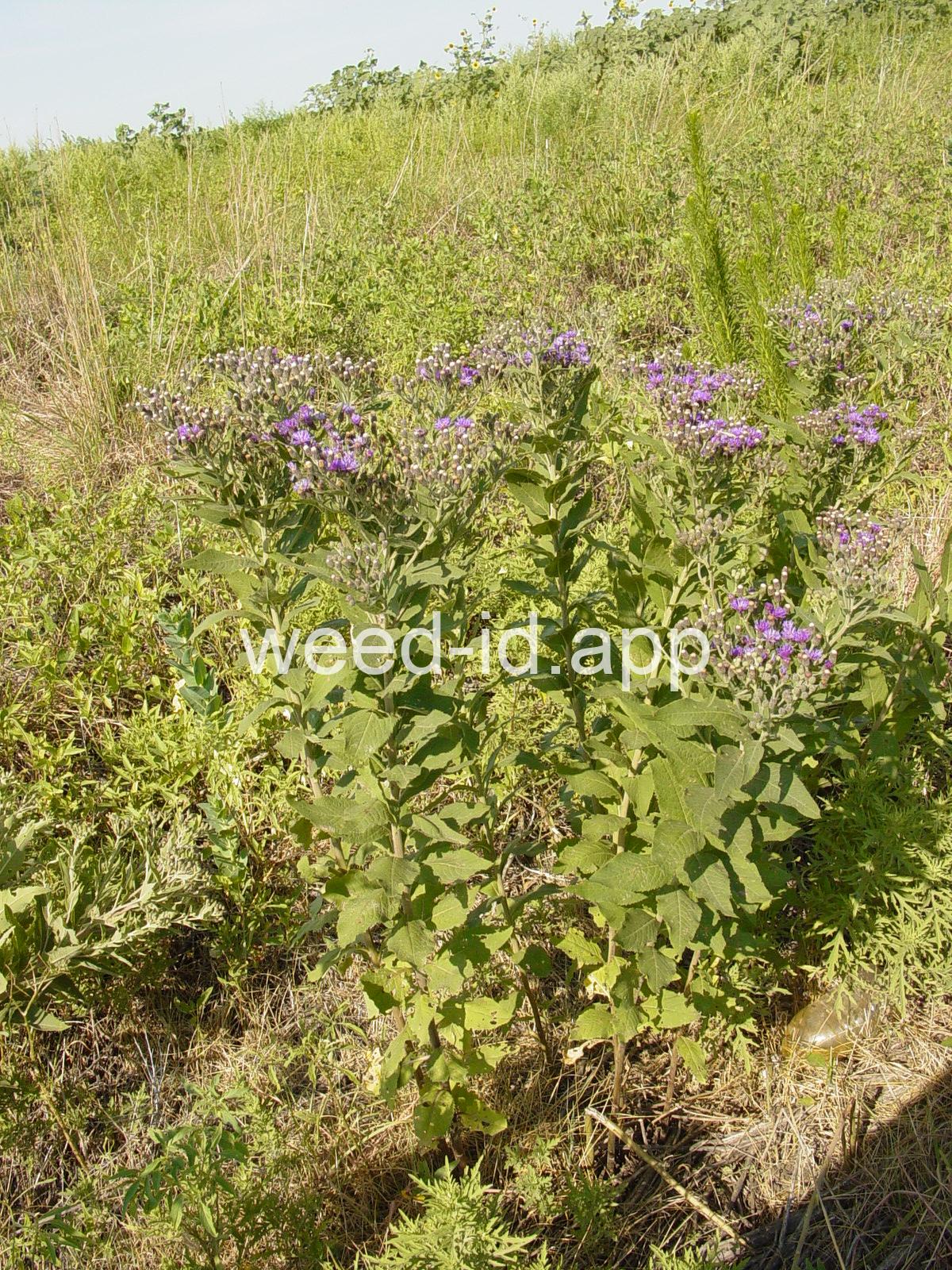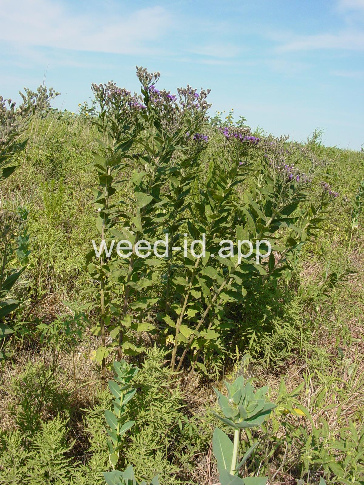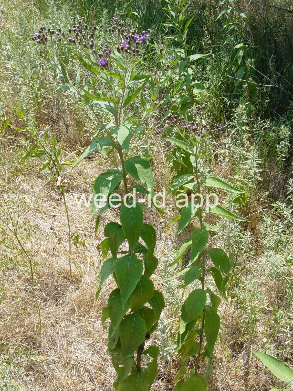 A densely leafy, rhizomatous perennial with a much branched terminal cluster of small purple flower heads. The bracts recurved at maturity and about 30 flowers per head.
