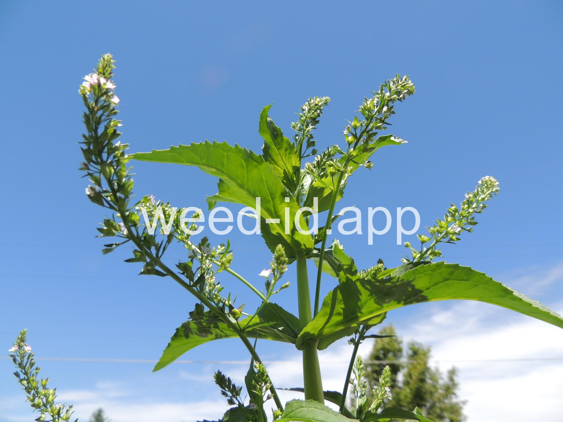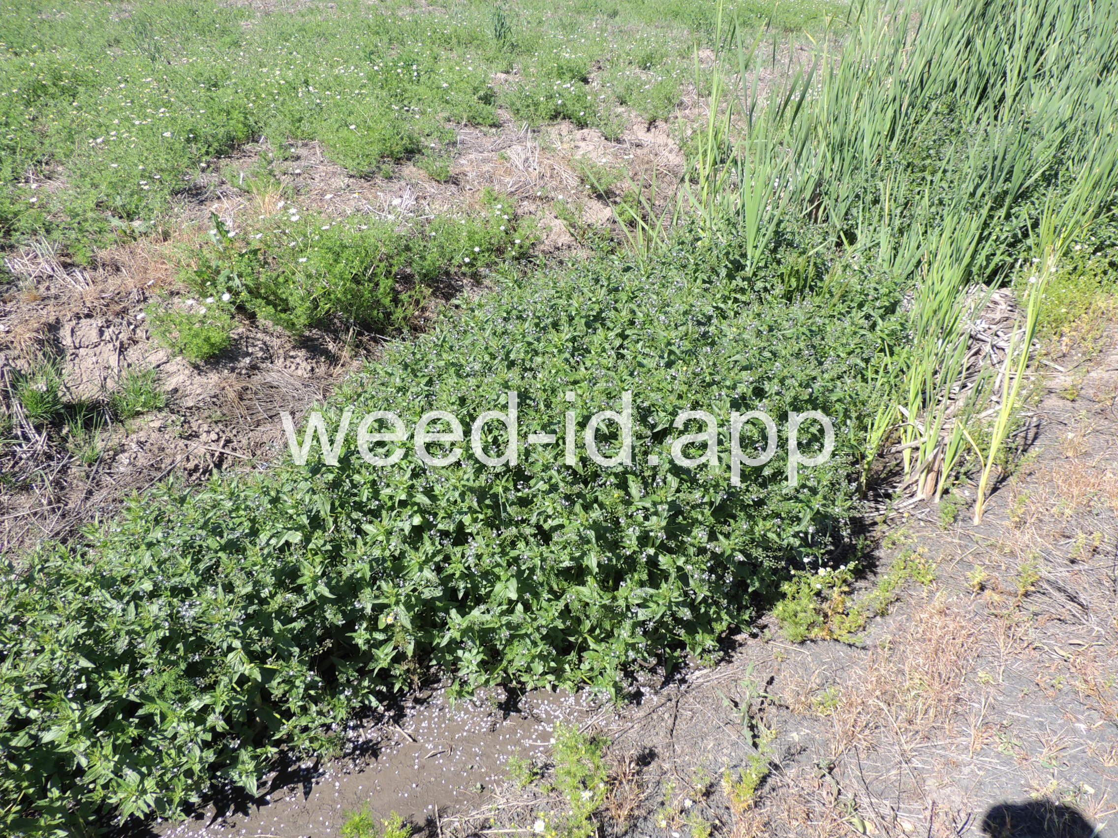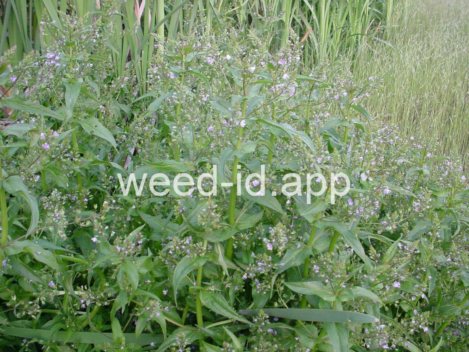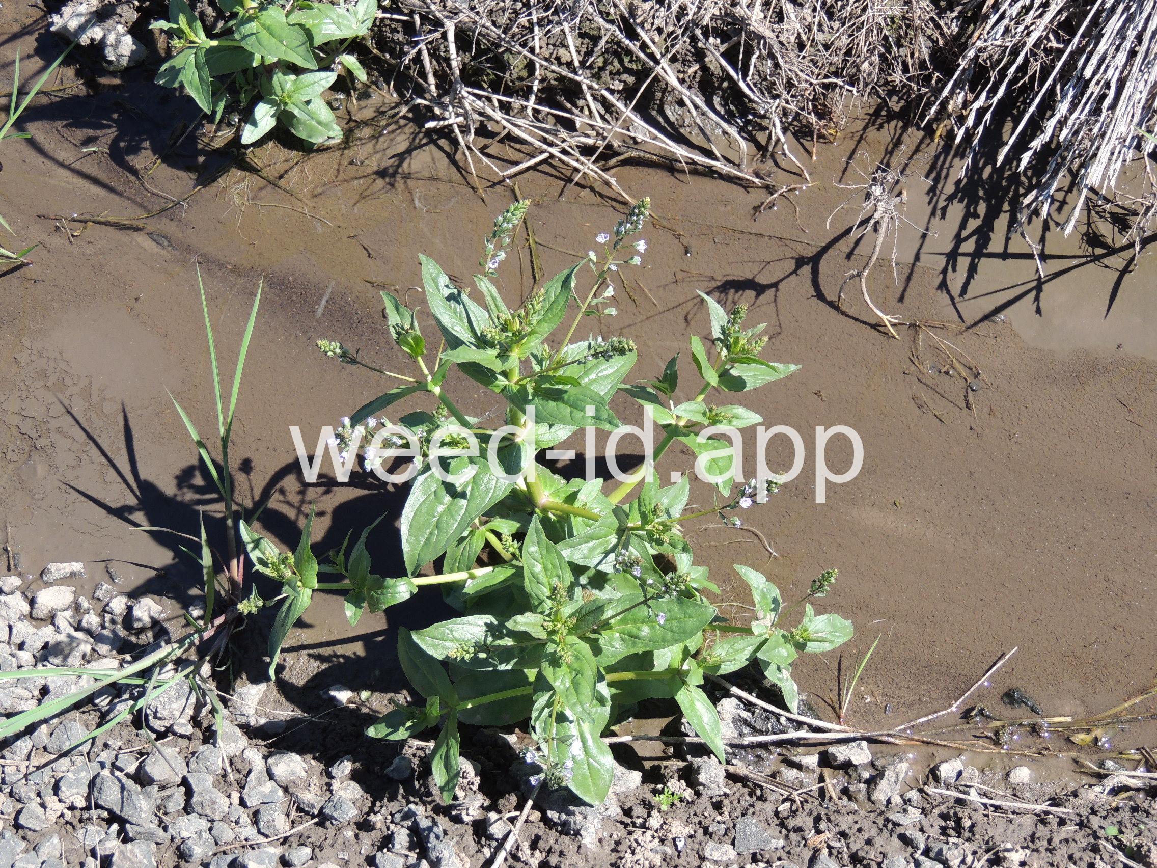 A common species of drainage ditches. Often found with monkey flower. The leaves are elongate and opposite. The small bluish flowers are somewhat irregular with two stamens and dark veined petals.