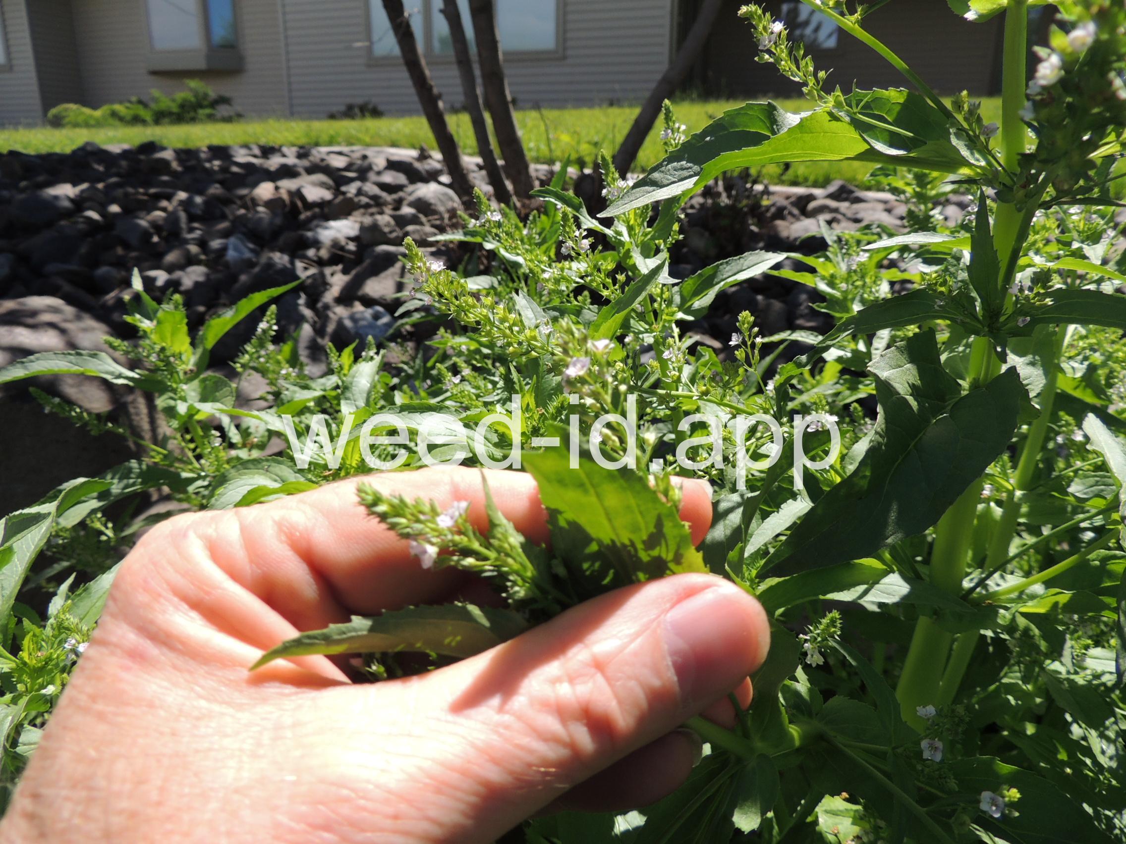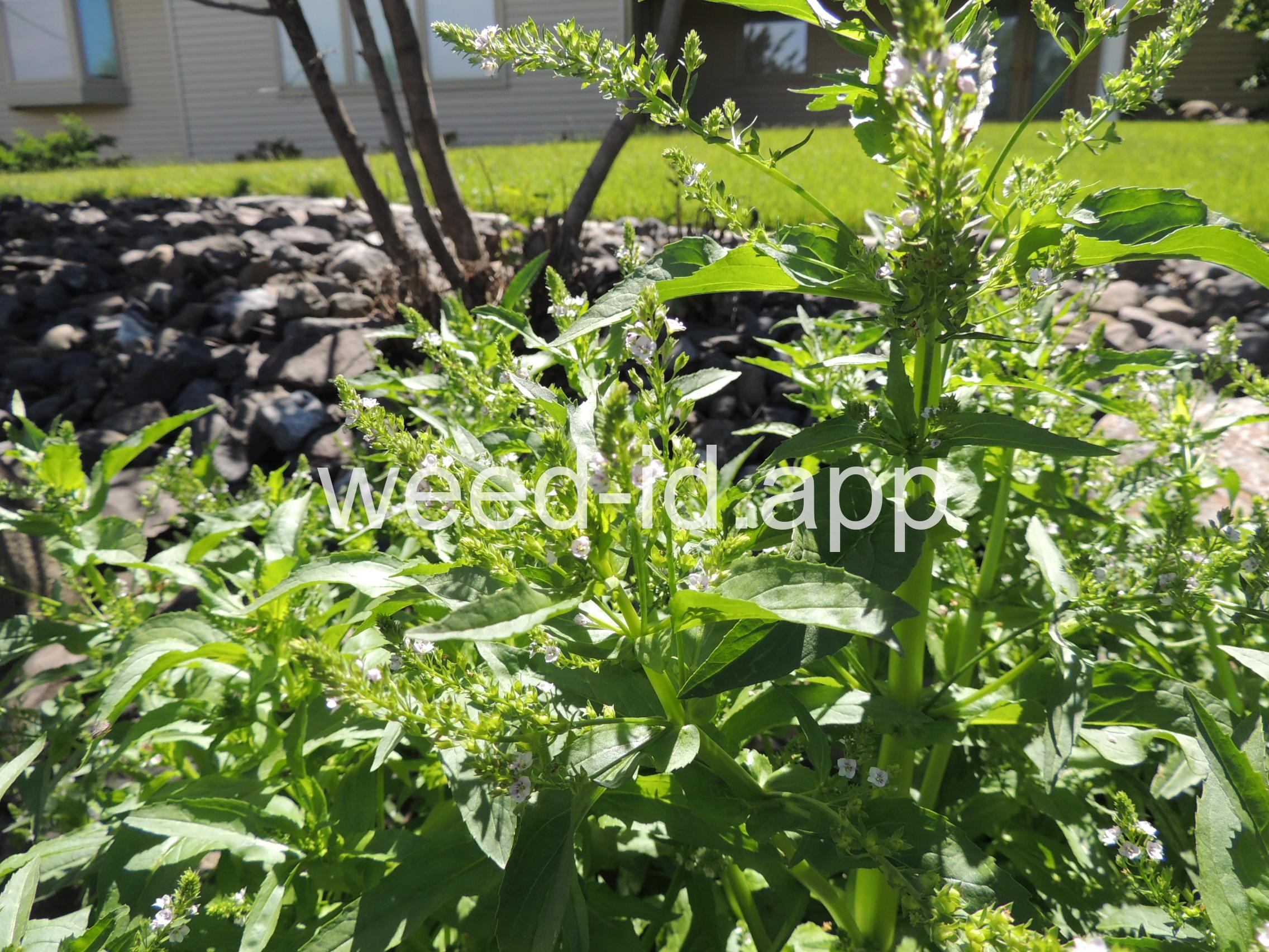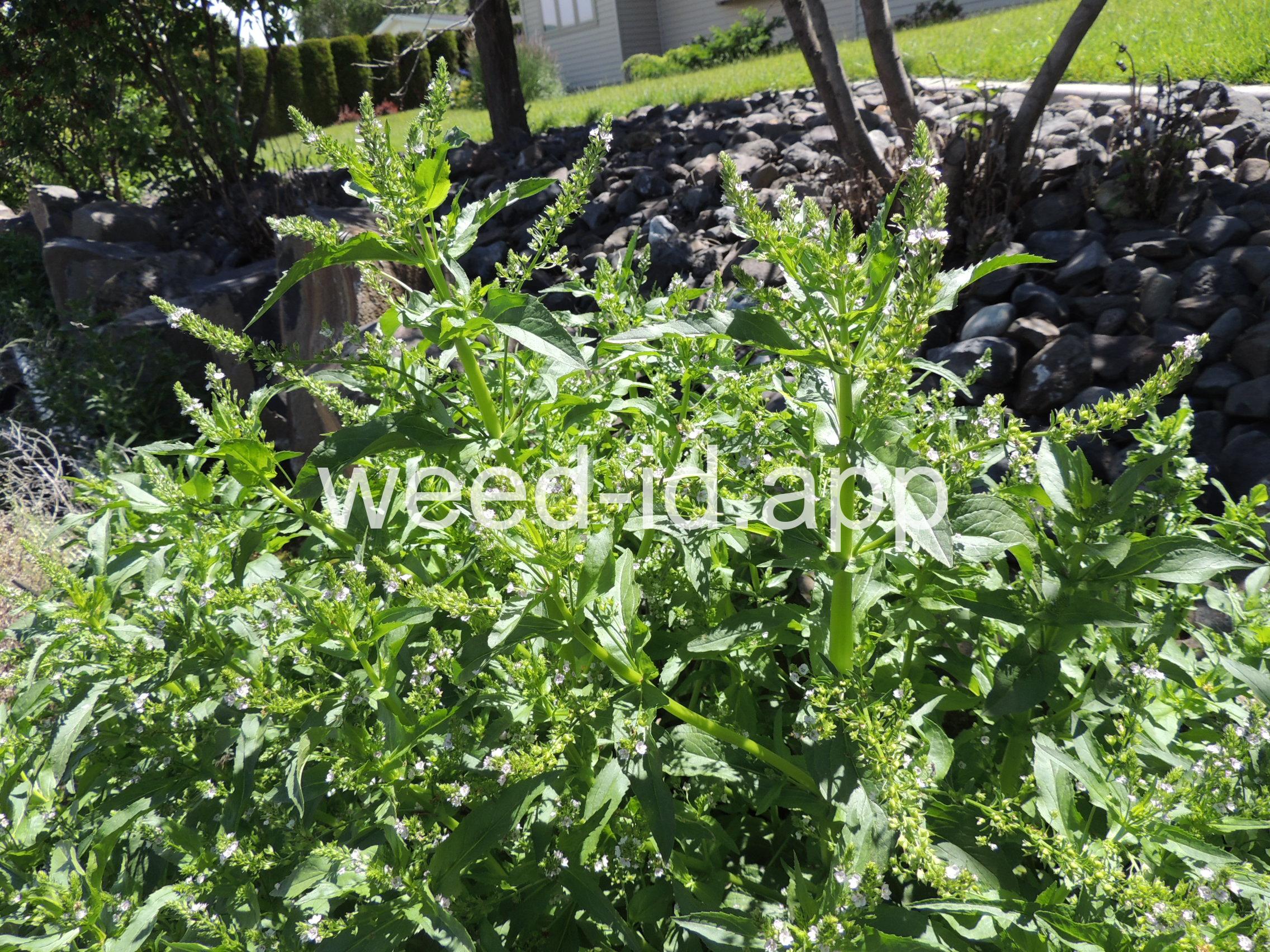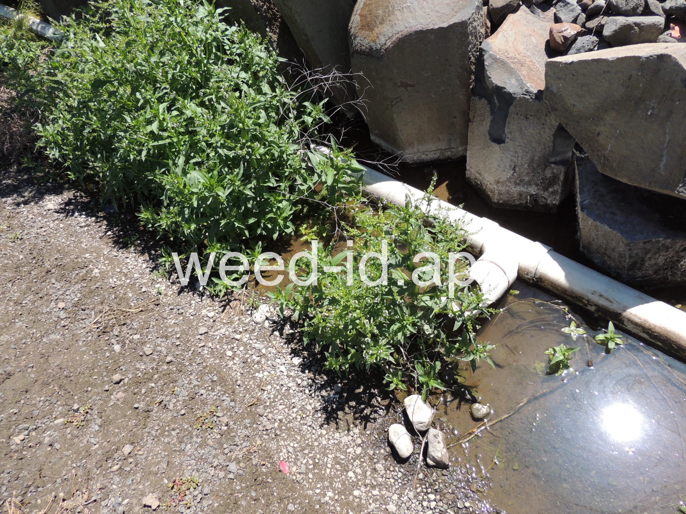 A common species of drainage ditches. Often found with monkey flower. The leaves are elongate and opposite. The small bluish flowers are somewhat irregular with two stamens and dark veined petals.