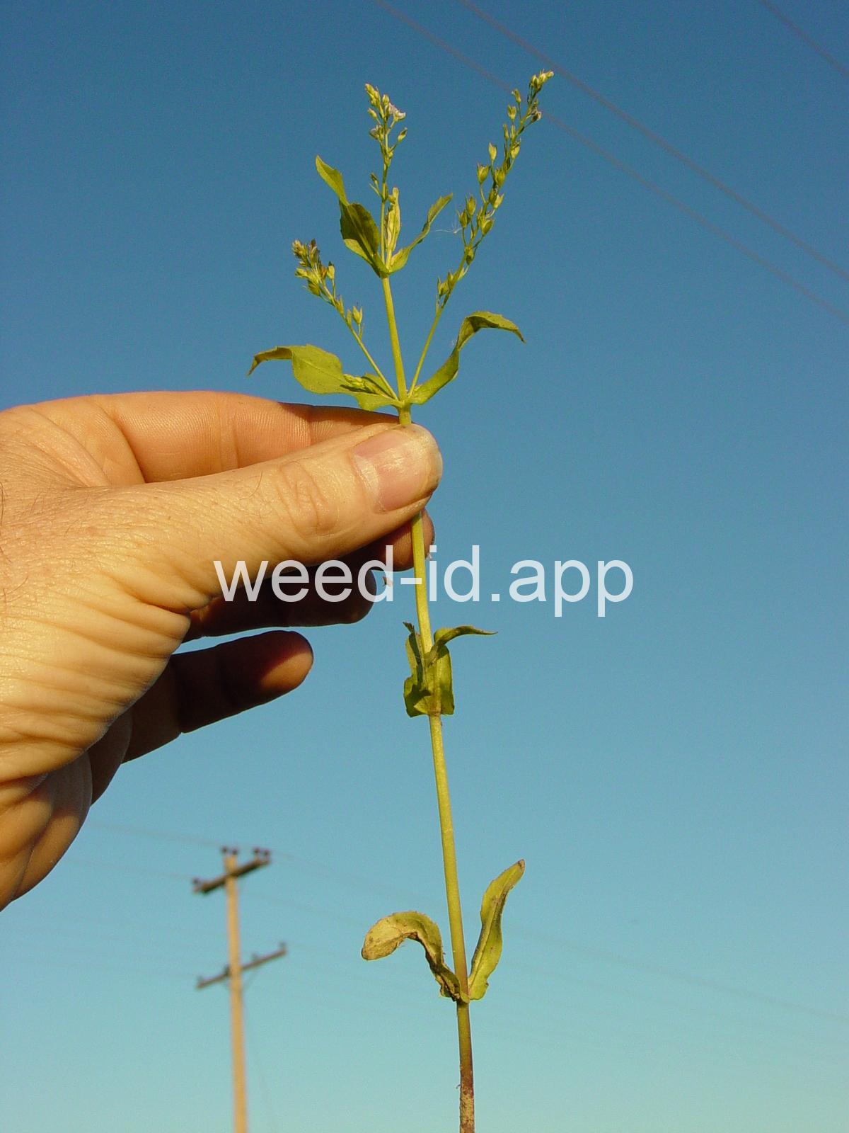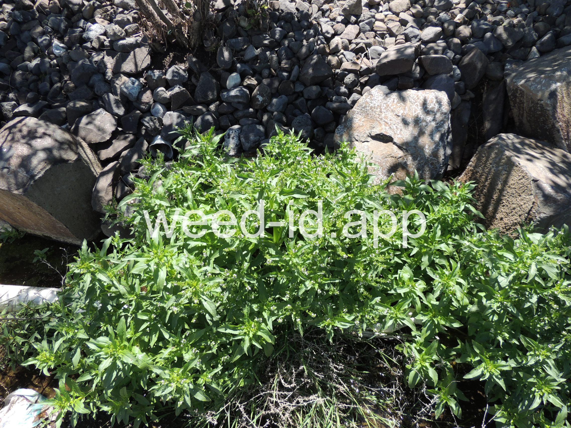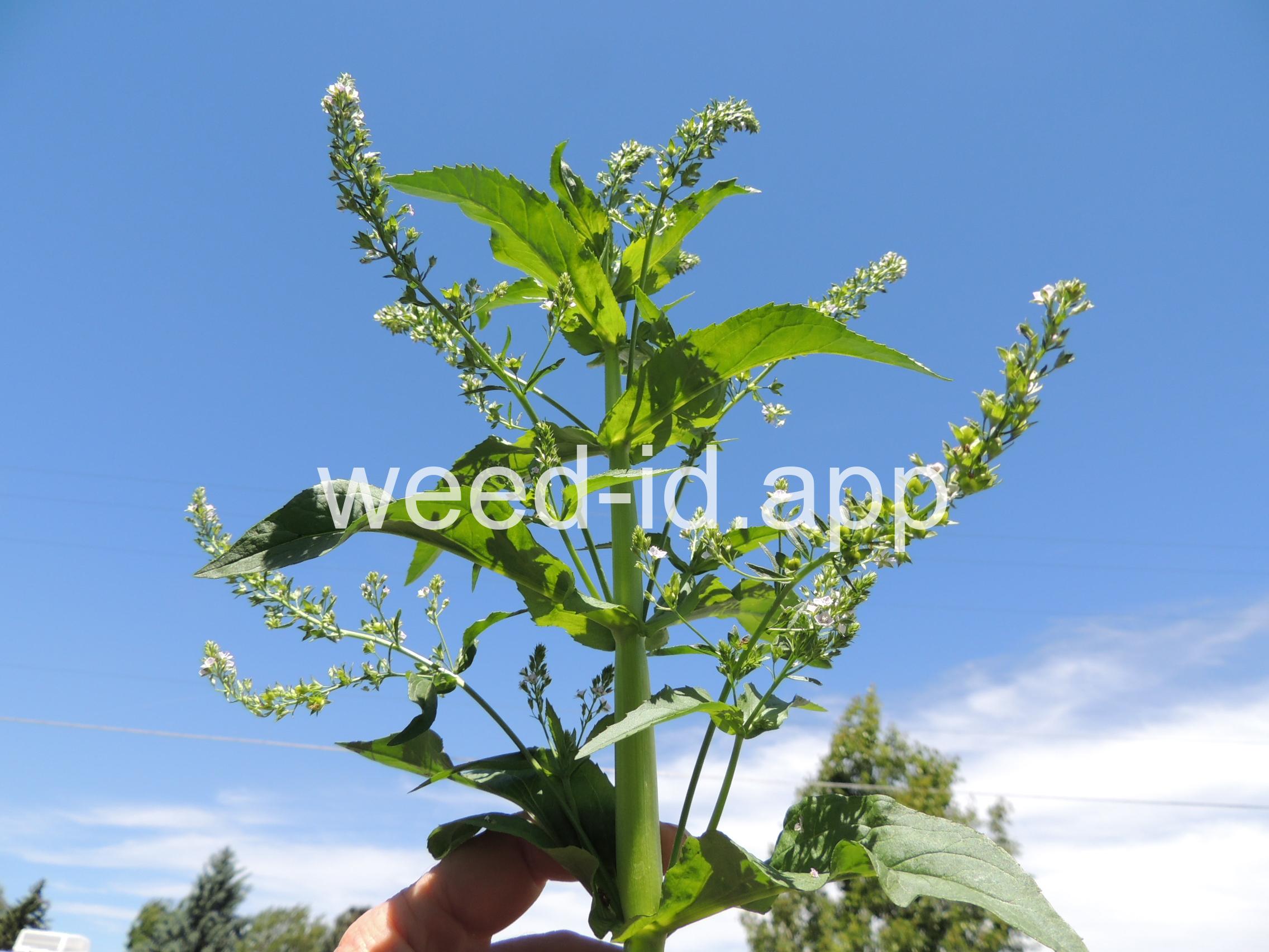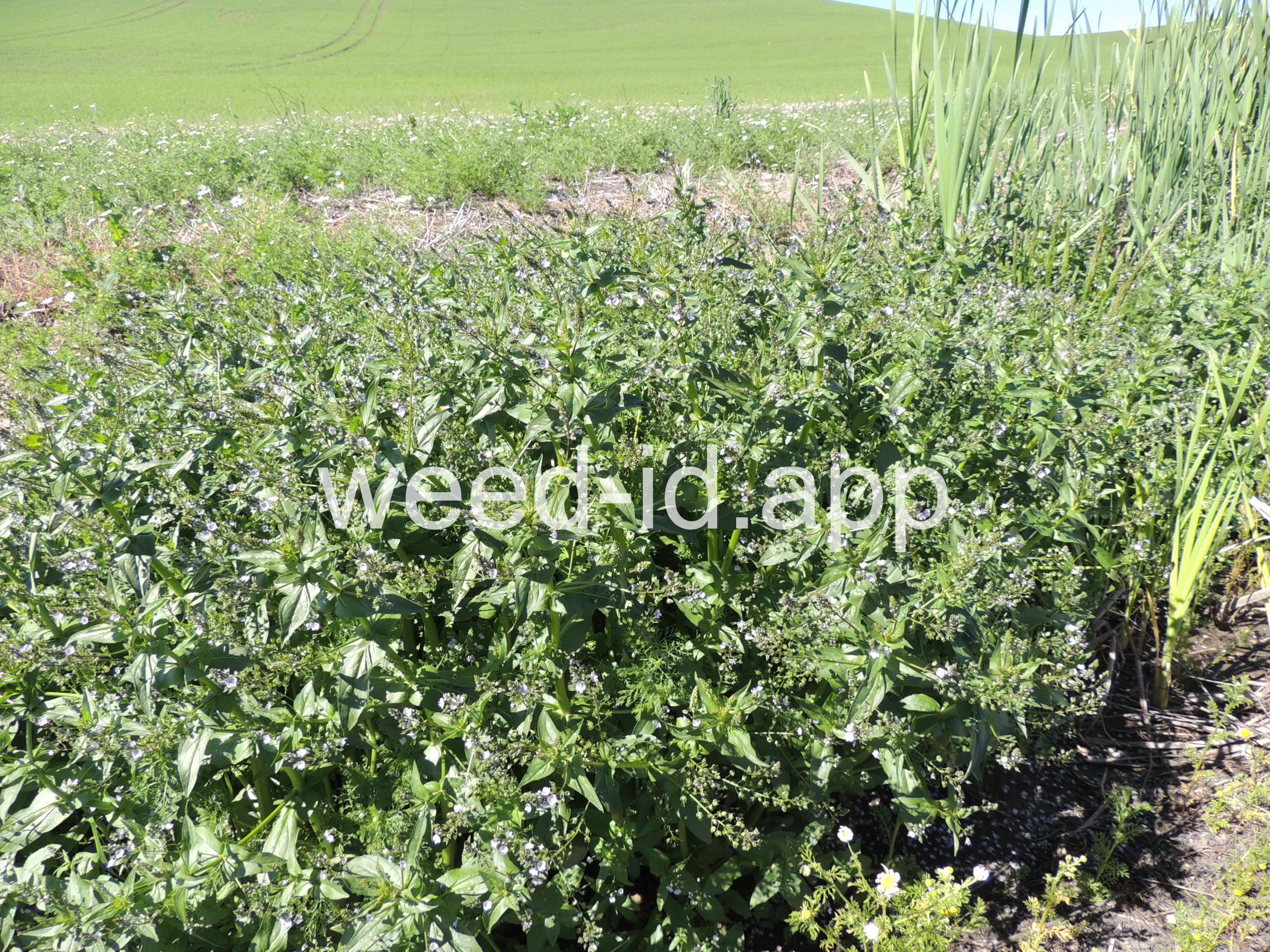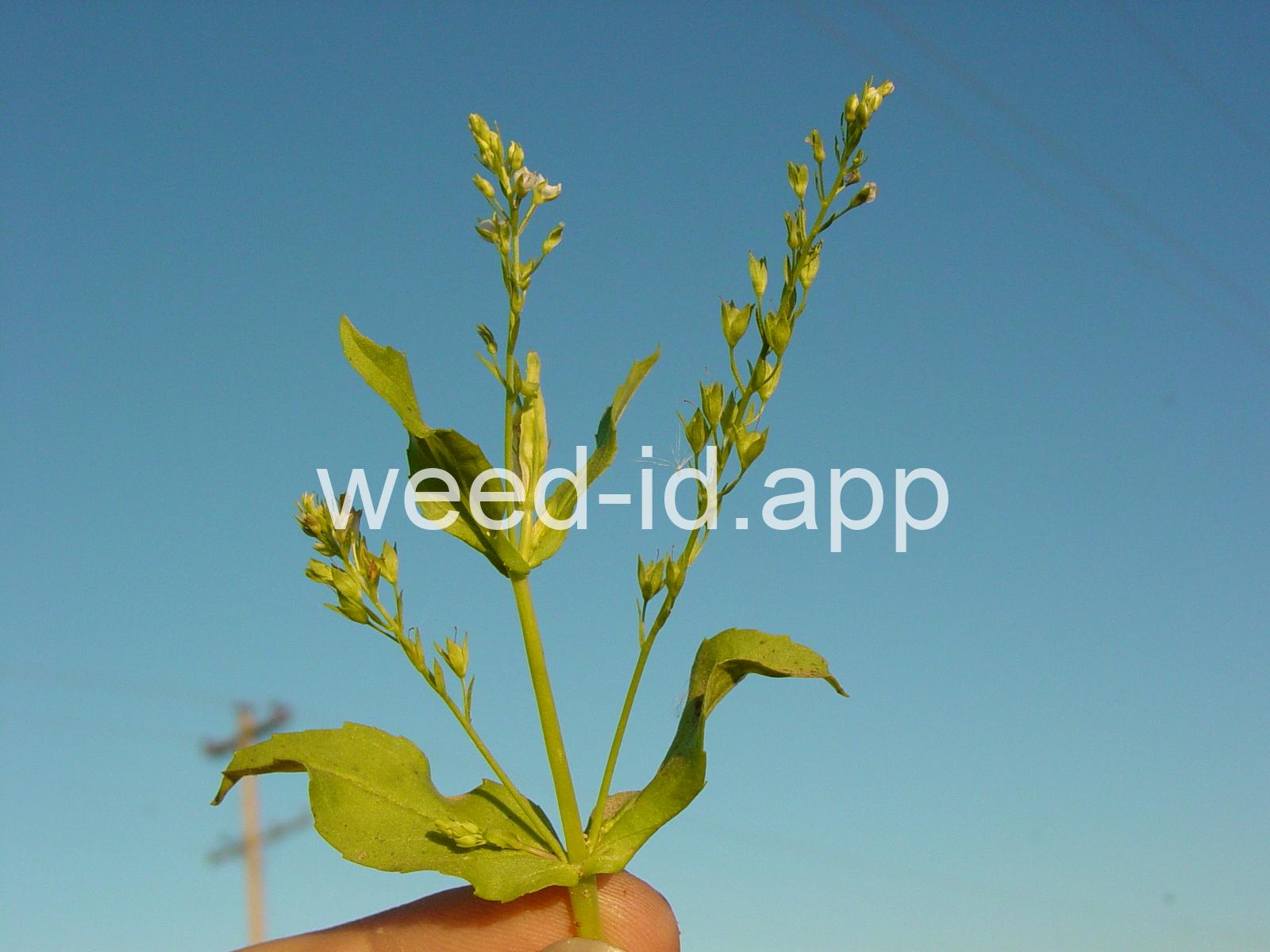 A common species of drainage ditches. Often found with monkey flower. The leaves are elongate and opposite. The small bluish flowers are somewhat irregular with two stamens and dark veined petals.
