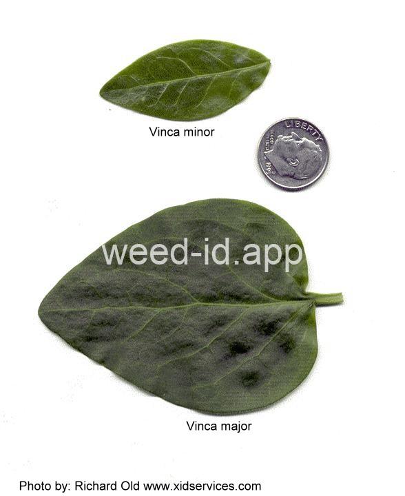 Very similar to common periwinkle (Vinca minor) but both the leaves and flowers larger. Ornamental evergreen groundcover often escaping and persisting.